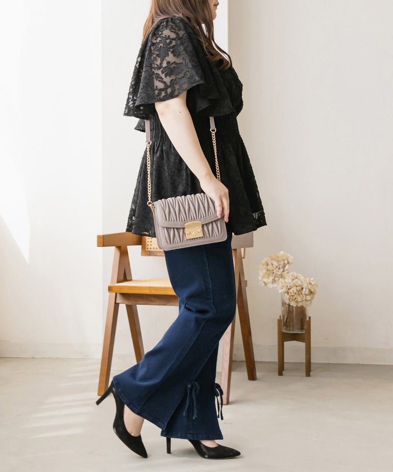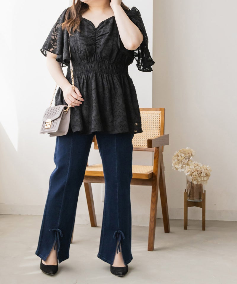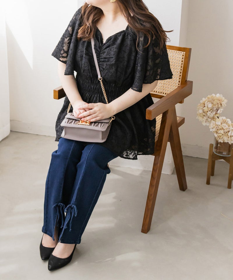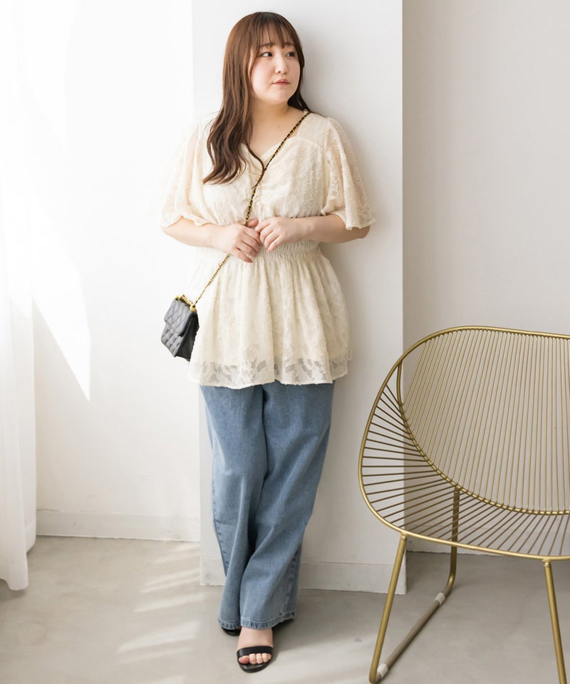 LLを着て程よいサイズ感でした。バストやヒップ回りは余裕があって、ウエストは柔らかいシャーリングになっているから窮屈感の無い着心地です♪らくちんだけど、メリハリのあるペプラムシルエットだから気になる部分は隠しつつ女性らしい印象に着こなせます!袖だけほんのり透け感があって、二の腕が全く気にならないフレアシルエットなのも可愛いです。風通しのいいデザインで、吸水性のあるカットソー裏地だから暑い時期も快適な着心地です◎