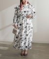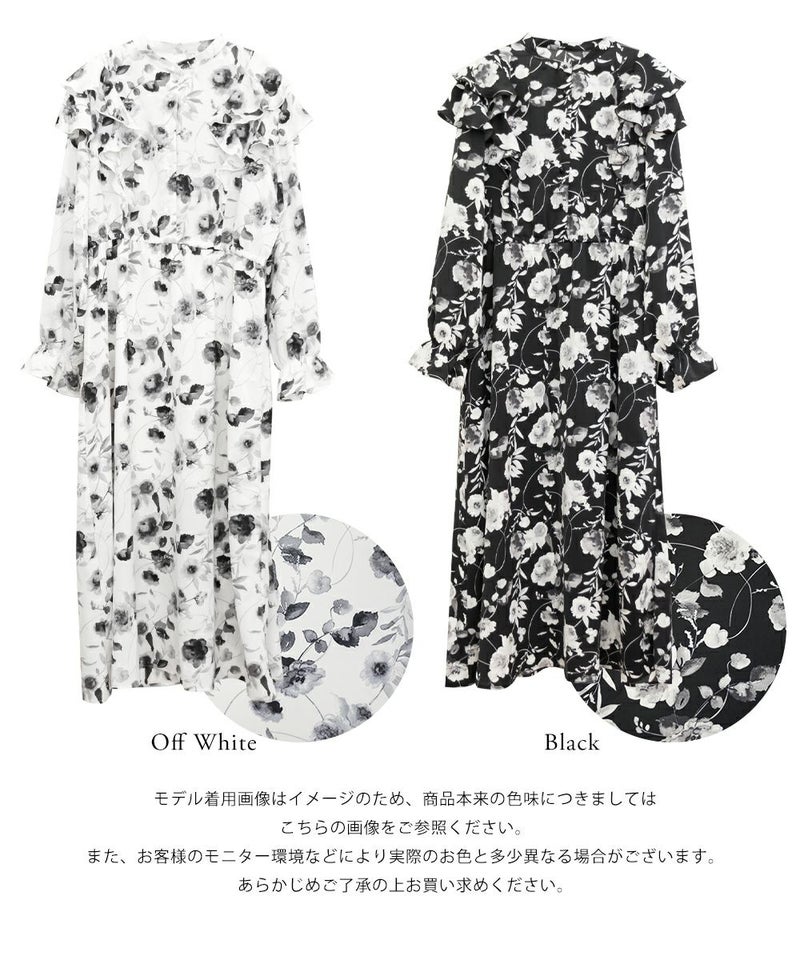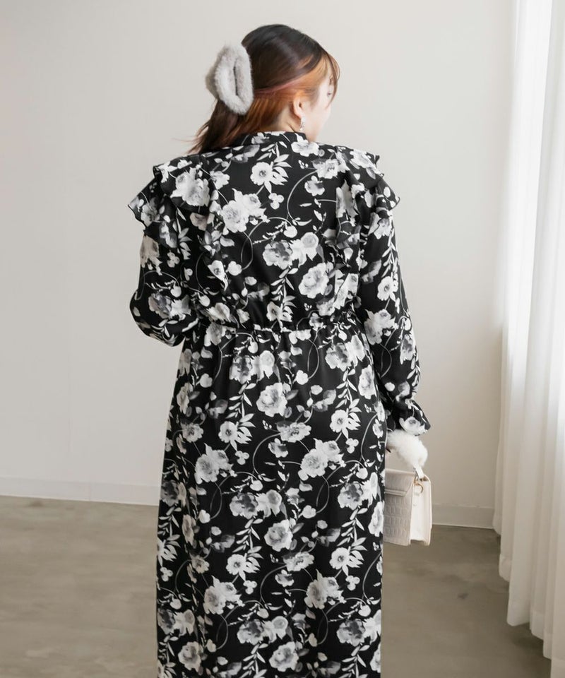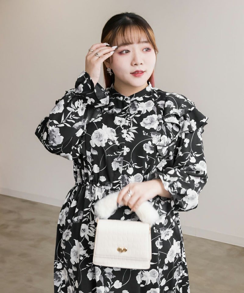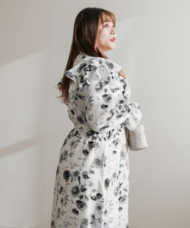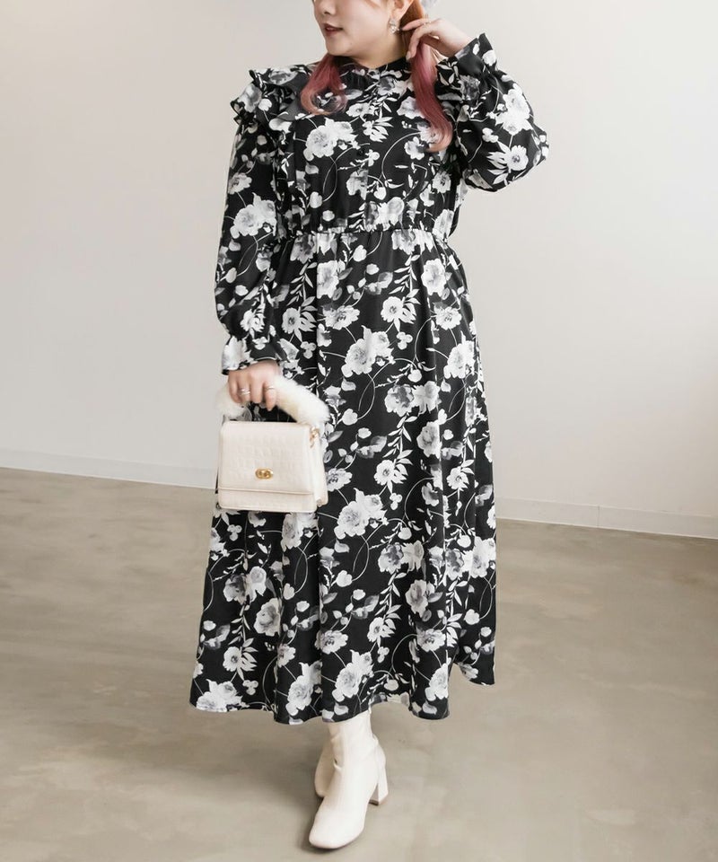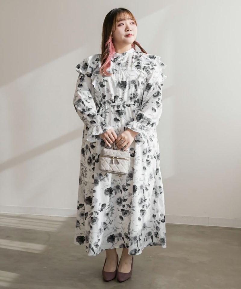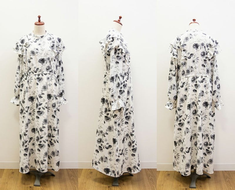3Lサイズを着用していつも通りのサイズ感でした。ウエストはゴム入りでフィット&フレアのシルエットが女性らしいワンピースです!大人っぽいモノトーンの花柄で使いやすいワンピースです。肩にフリルがついていて肩回りの丸みをカバーしてくれます♪軽い着心地なのでお出かけや旅行など動くシーンにもおすすめです◎