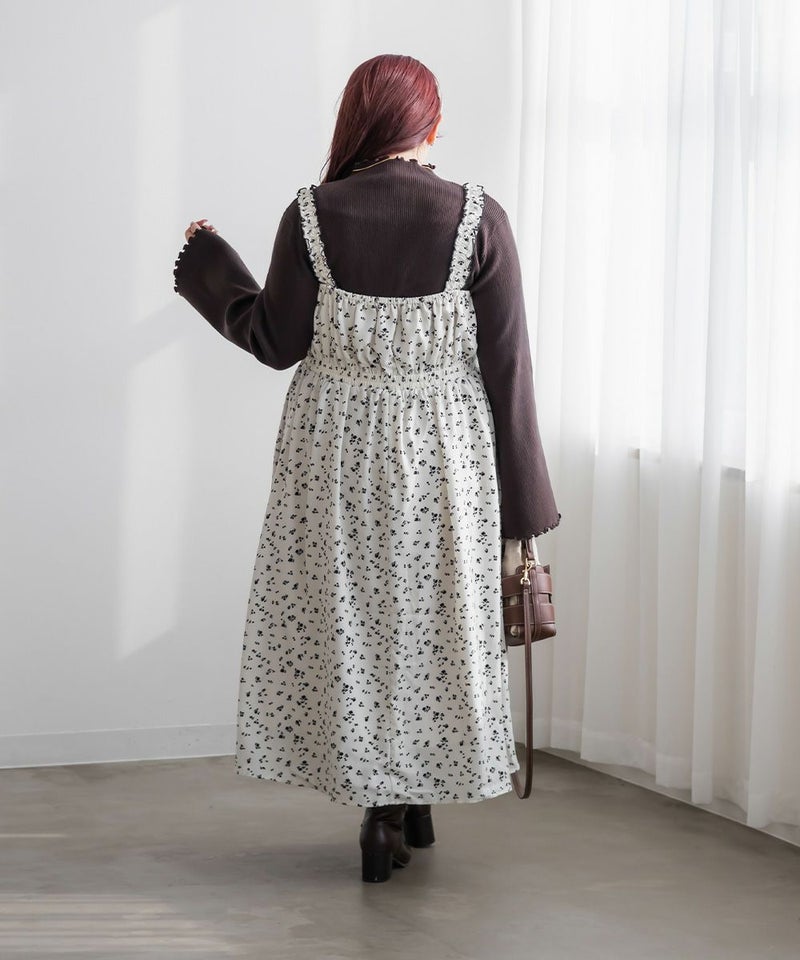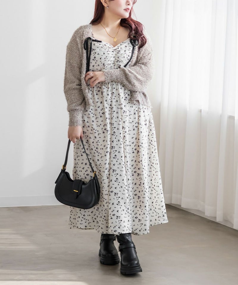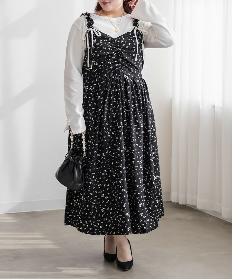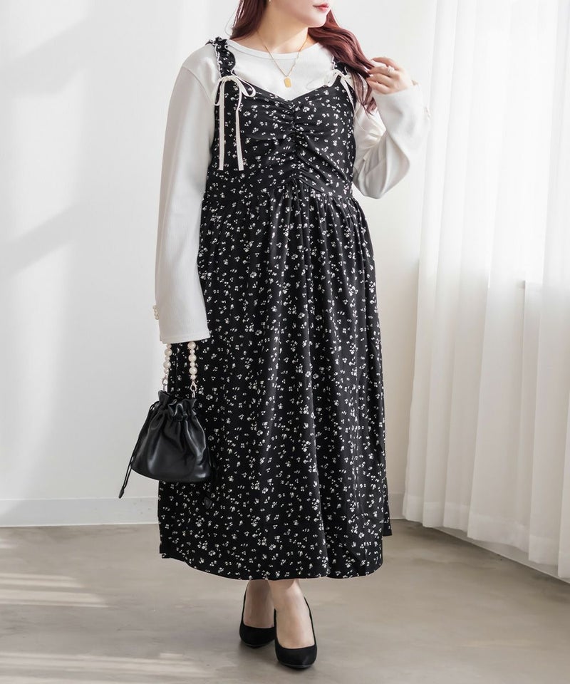 3Lを着てちょうどいいサイズ感した。身頃は程よくゆとりがあって、窮屈感なくリラクシーに着られます。華やかなフラワープリントが目を惹くワンピースは、肩に配色リボンがついていてかわいいアクセントになります!生地は程よく落ち感があって、広がりすぎないシルエットなのも大人っぽく着られるポイント◎ロングシーズン着られて、涼しくなってきたらカーディガンやデニムジャケットを羽織ってカジュアルダウンするのもおすすめです!一枚でしっかり映える主役級ワンピなので、ちょっとしたお出かけや女子会にもぴったりです♪
