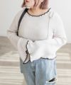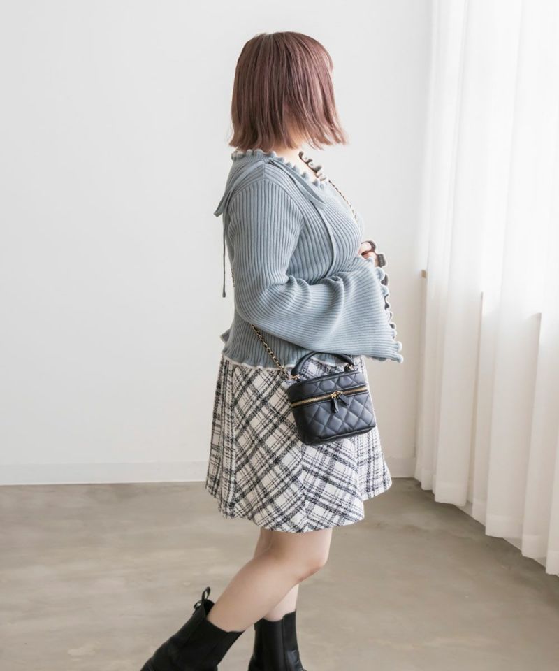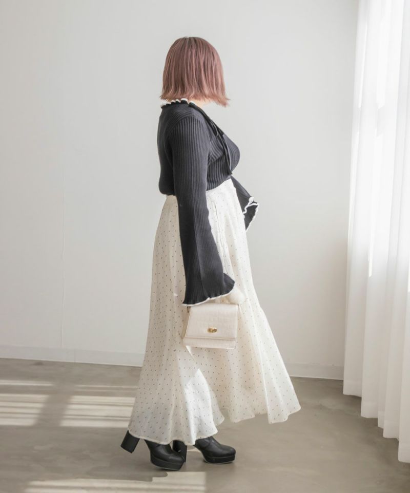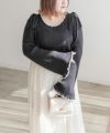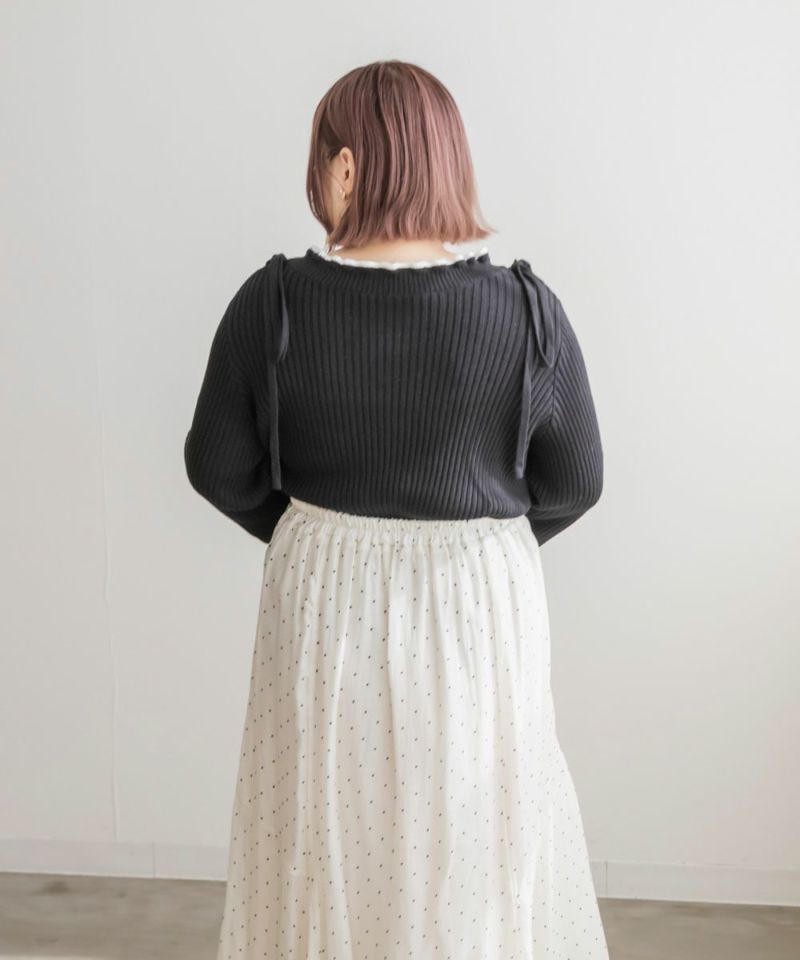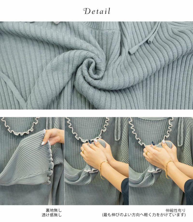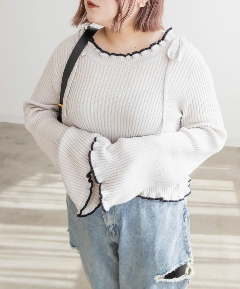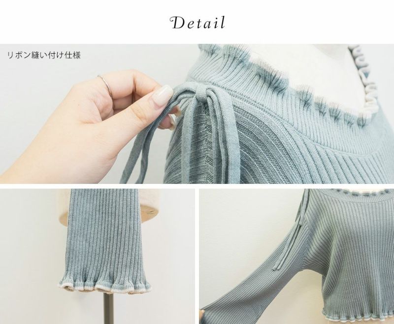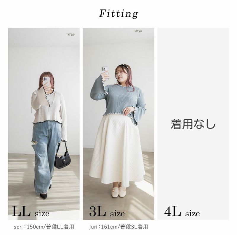 LLを着てちょうどいいサイズでした。柔らかくて着心地の良いリブニットで、身体にピタッとフィットしないくらうのゆとりがあります。襟はゆったりとあいていて、肩には細目のリボンが大人っぽくついています。袖は、正直なところお鍋を食べたりは難しいデザインですが、腕が長く、手元が女性らしさたっぷりな印象になれるおしゃれ可愛いデザインです◎手元に向かって広がるから二の腕を強調しないのも嬉しいです♪少し短めの着丈だから、裾を出した状態でバランスよく、着られて、スタイルが良く見える1枚です!