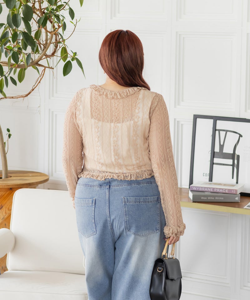 3Lサイズを着用しました。肩回りも腕周りも窮屈感はなく、ちょうどよく羽織れました♪ 総レースデザインですが柔らかく、軽やかな着心地です。 フリルとリボンがポイントになって、シンプルなインナーに合わせるだけでもぐっと華やかに◎ 羽織りとしても、前を閉じてトップス風に着ても可愛く着こなせました。