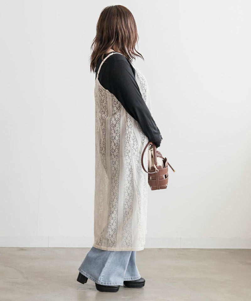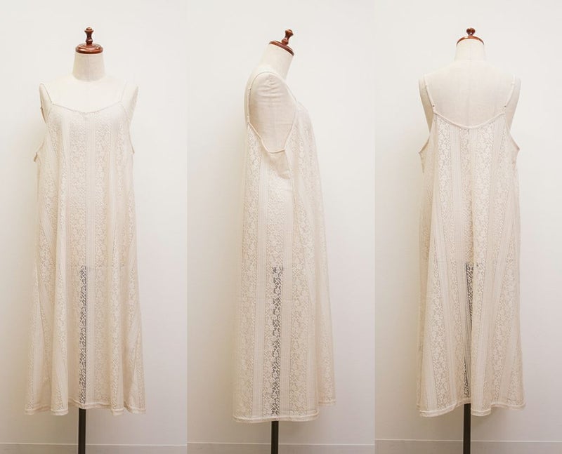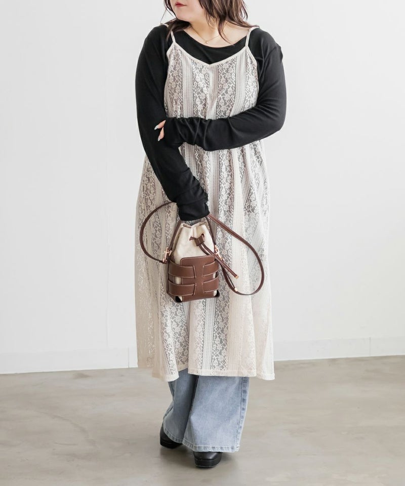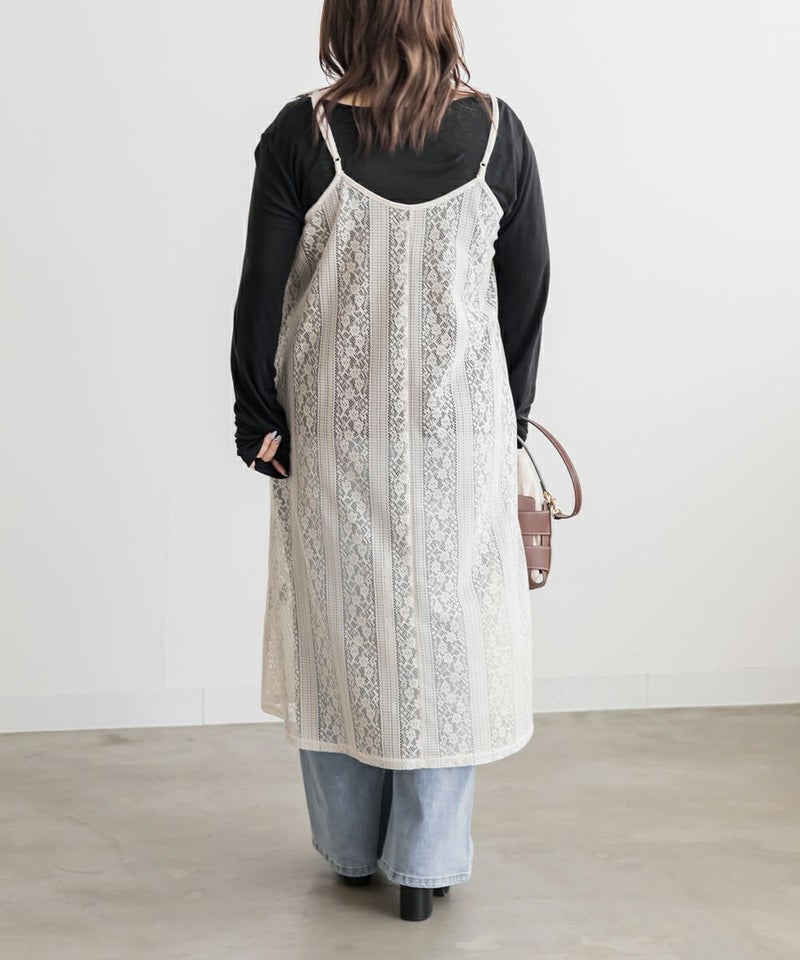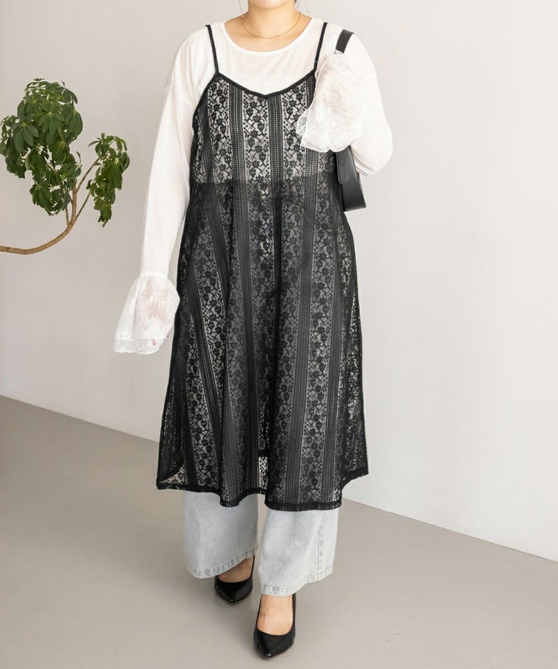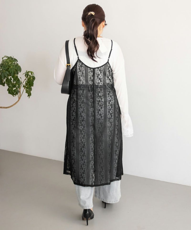 3Lを着てちょうどよかったです!総レースの華やかさが引き立つキャミワンピースです。 肩紐はアジャスター付きなので長さ調整もでき、自分に合わせたバランスで着こなせます。裾に向かって少し広がるシルエットが女性らしく、インナー次第幅広く活躍する一枚です♪1枚あると色々な雰囲気のレイヤードスタイルを楽しめます◎