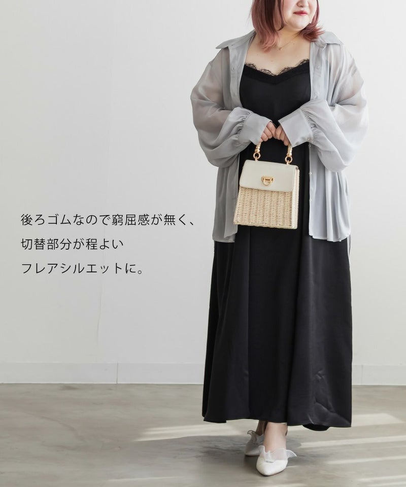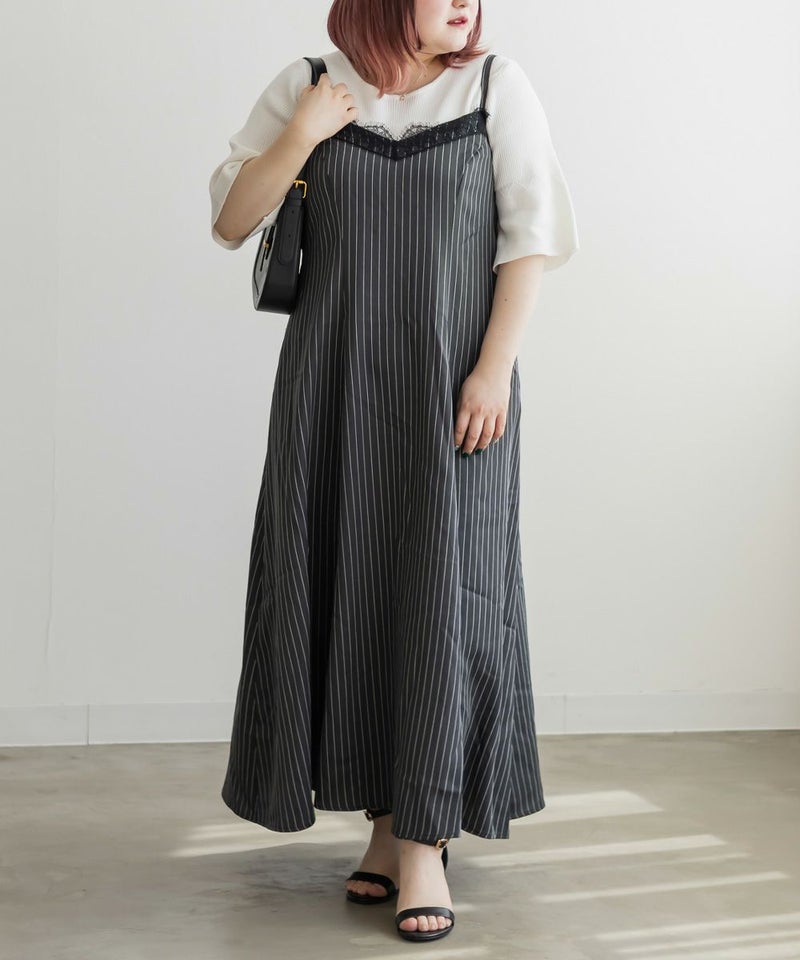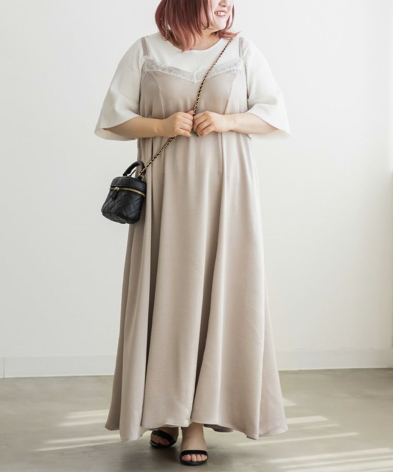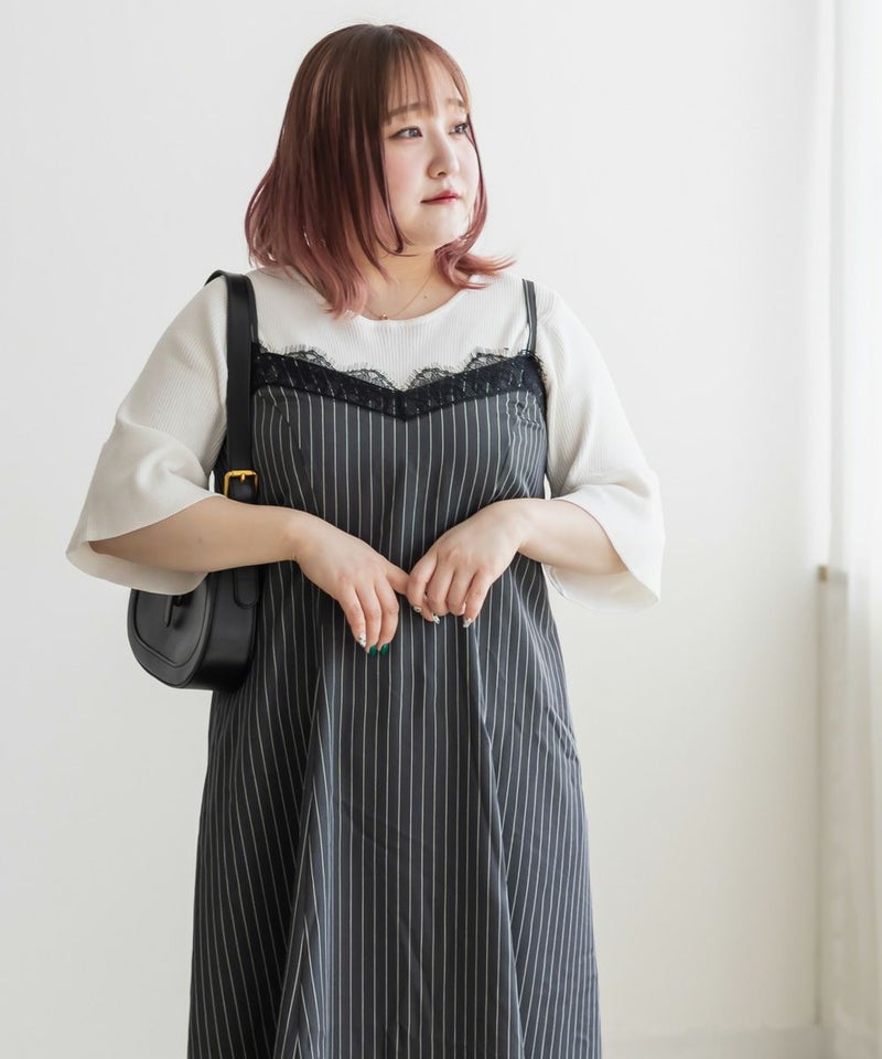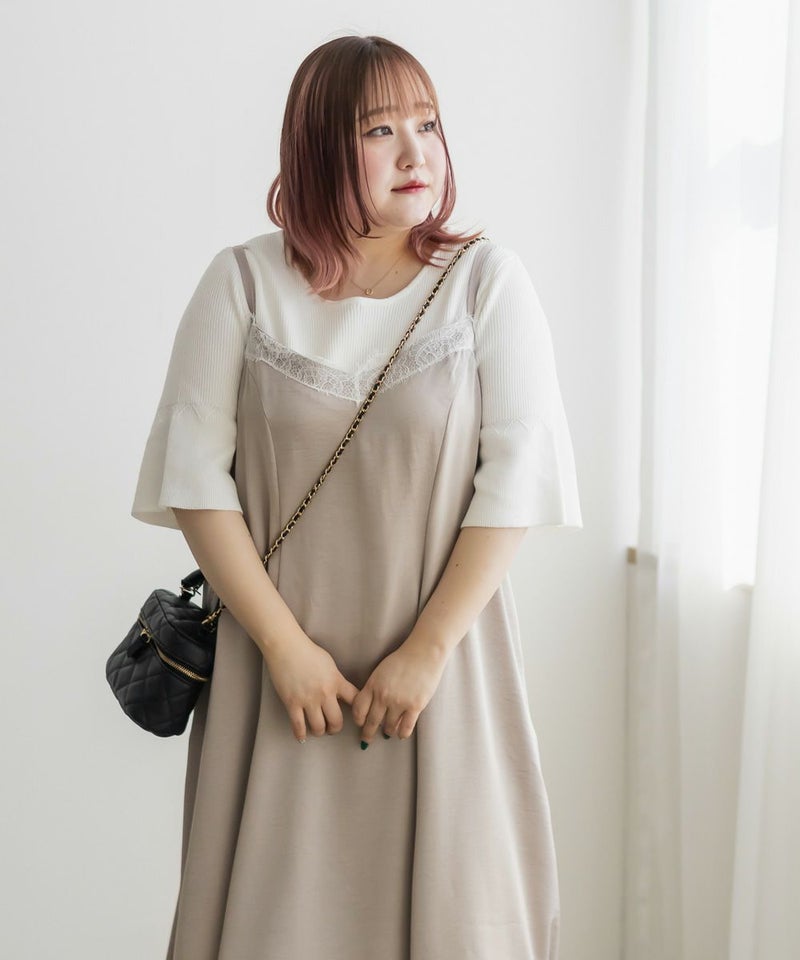 3Lサイズを着用しました。肩ひもはアジャスターで調節ができるので、自分の身長に合わせてバランスよく着ることができました◎ウエスト周りやヒップに程よくゆとりがあり、身体のラインを拾いすぎず、きれいなシルエットで着られました。繊細なレースが胸元に使われていて、フェミニンな雰囲気たっぷり♪ でも甘くなりすぎず、大人っぽく着こなせるのが嬉しいポイントです。季節を問わずインナー次第で着回しが効くのも魅力的です!Tシャツやブラウスとのレイヤードはもちろん、羽織を合わせてもレースが映えるので、1枚持っておくと本当に便利なアイテムだと思います◎