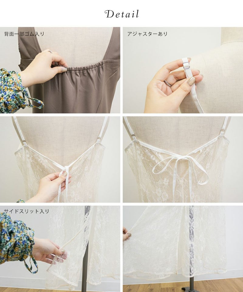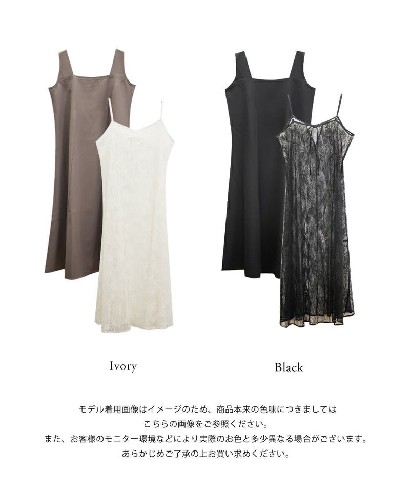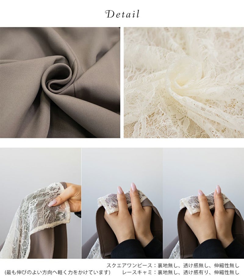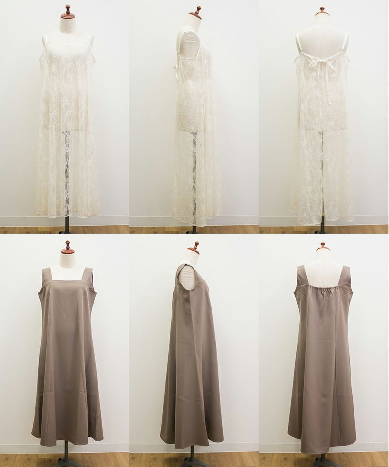 裏地・透け感・伸縮性 レースキャミ:裏地無し、透け感有り、伸縮性無し / スクエアワンピース:裏地無し、透け感無し、伸縮性無し