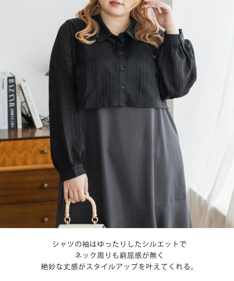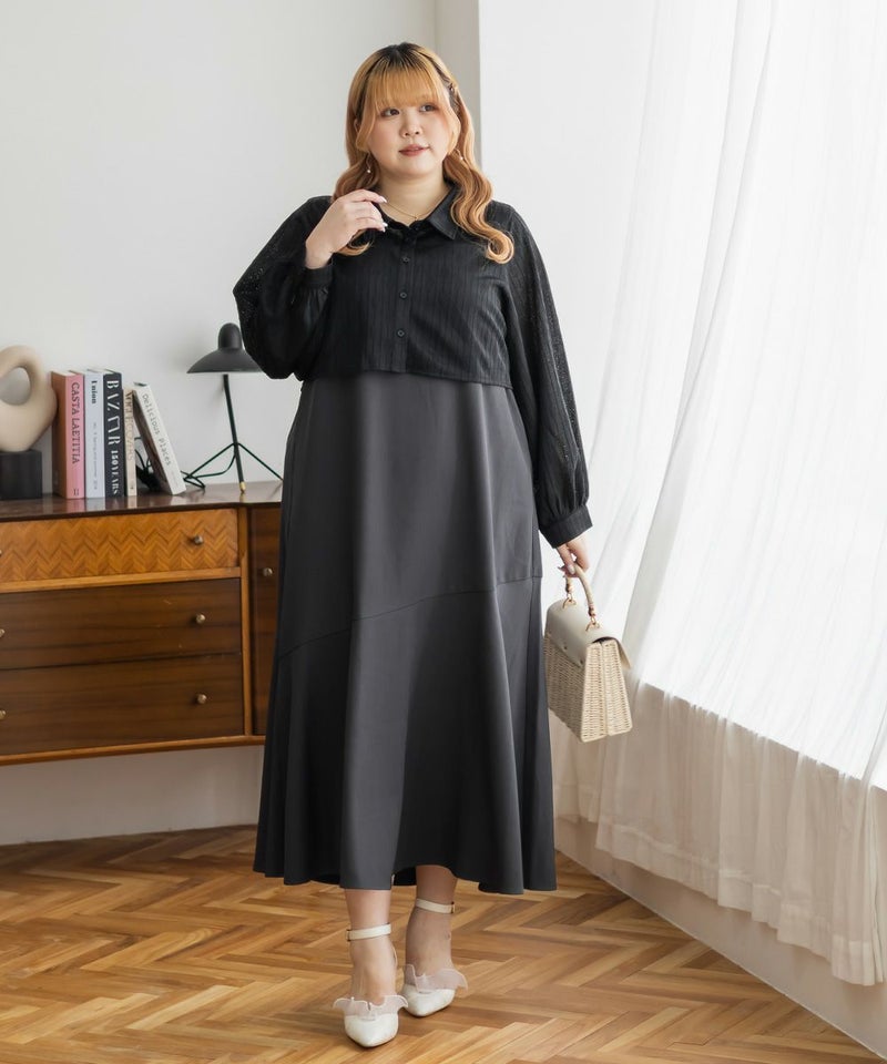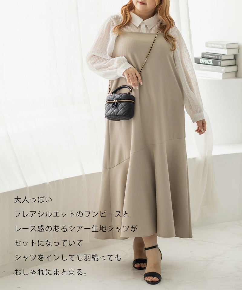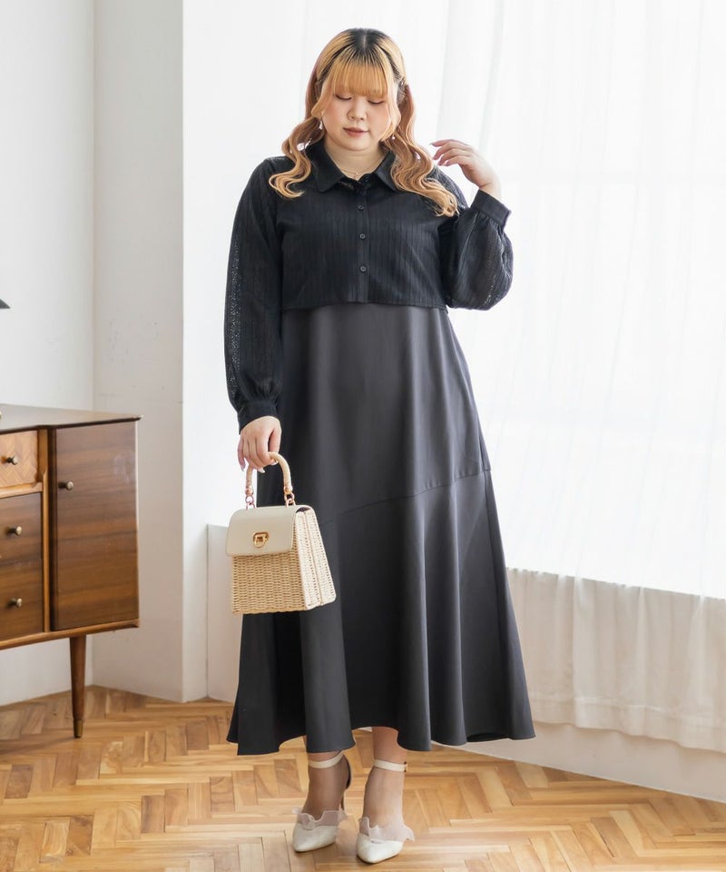 3Lを着て、ウエスト部分は締めつけ感がなく、程よくゆとりがありながらも、すっきりとしたシルエットなので、ちょうどいい着用感でした。レースシャツとワンピースのセットで着るだけでコーデが完成するのが嬉しいです◎ワンピースはストンと落ちるシルエットで、すっきりとした印象に見せてくれます。レースシャツは羽織るだけでこなれ感が出て、着こなしの幅が広がるのもポイントです。セットで着るのはもちろん、それぞれ単体でも使えて着回し力抜群です♪