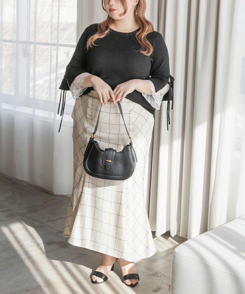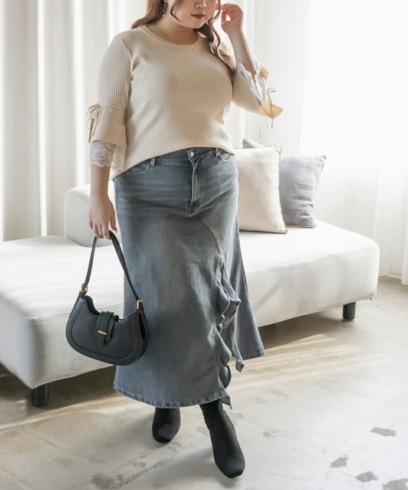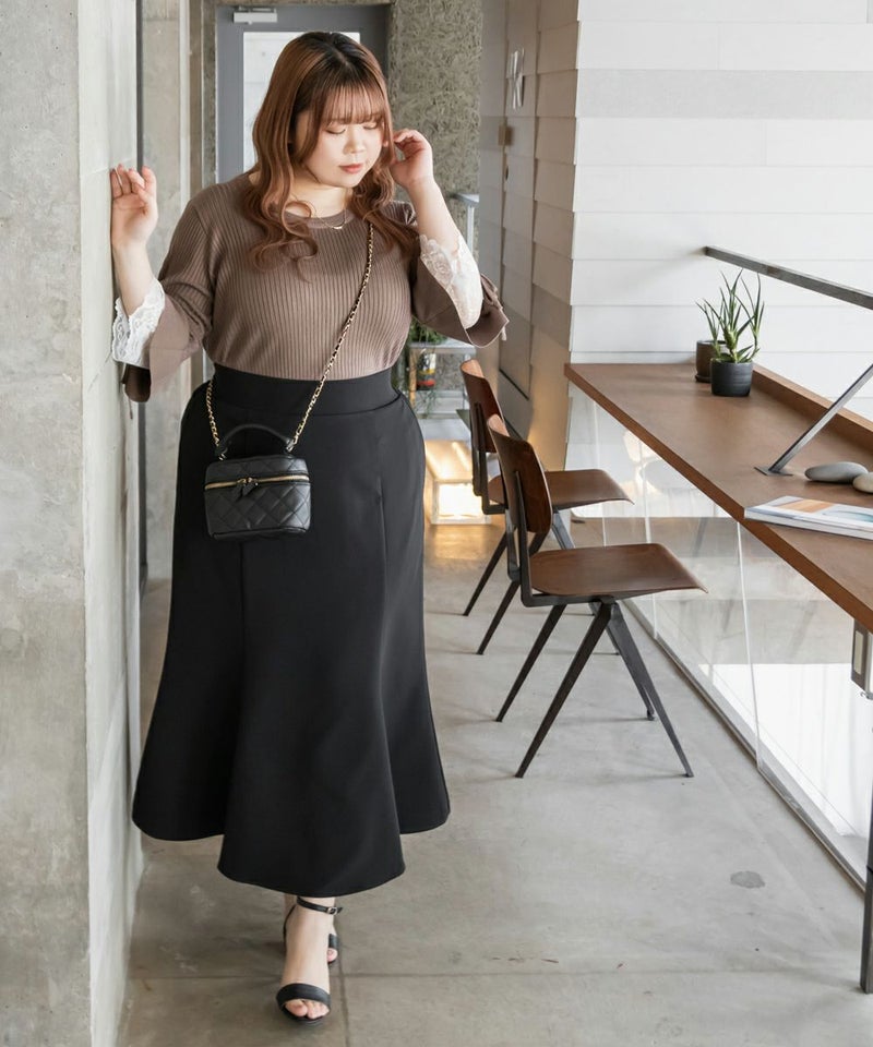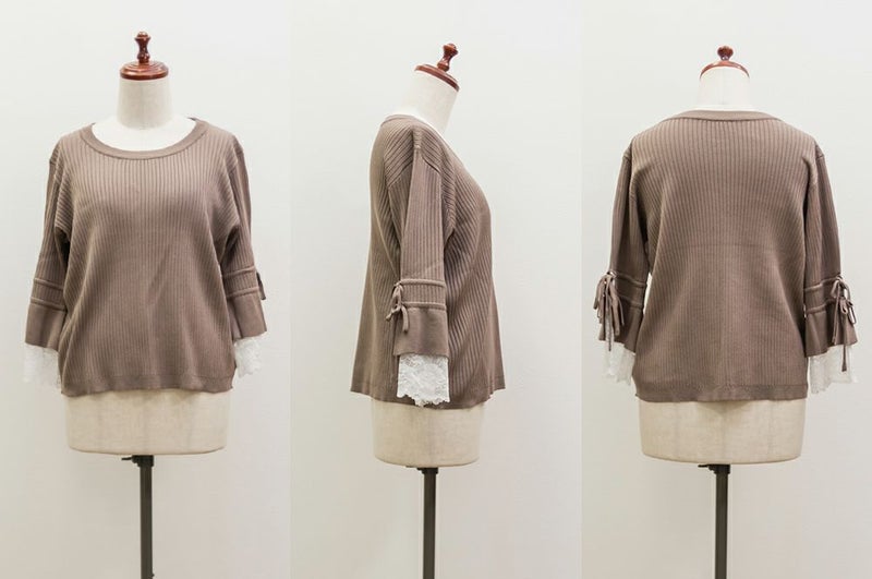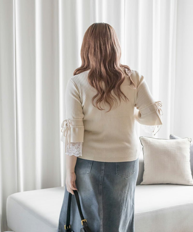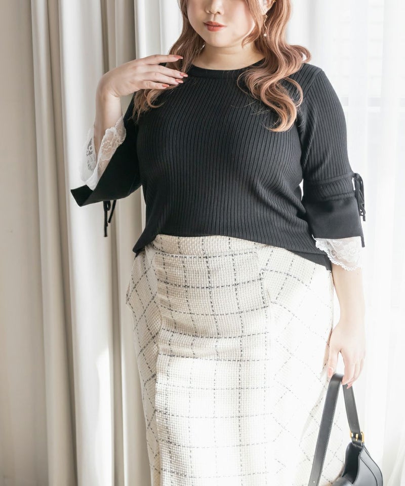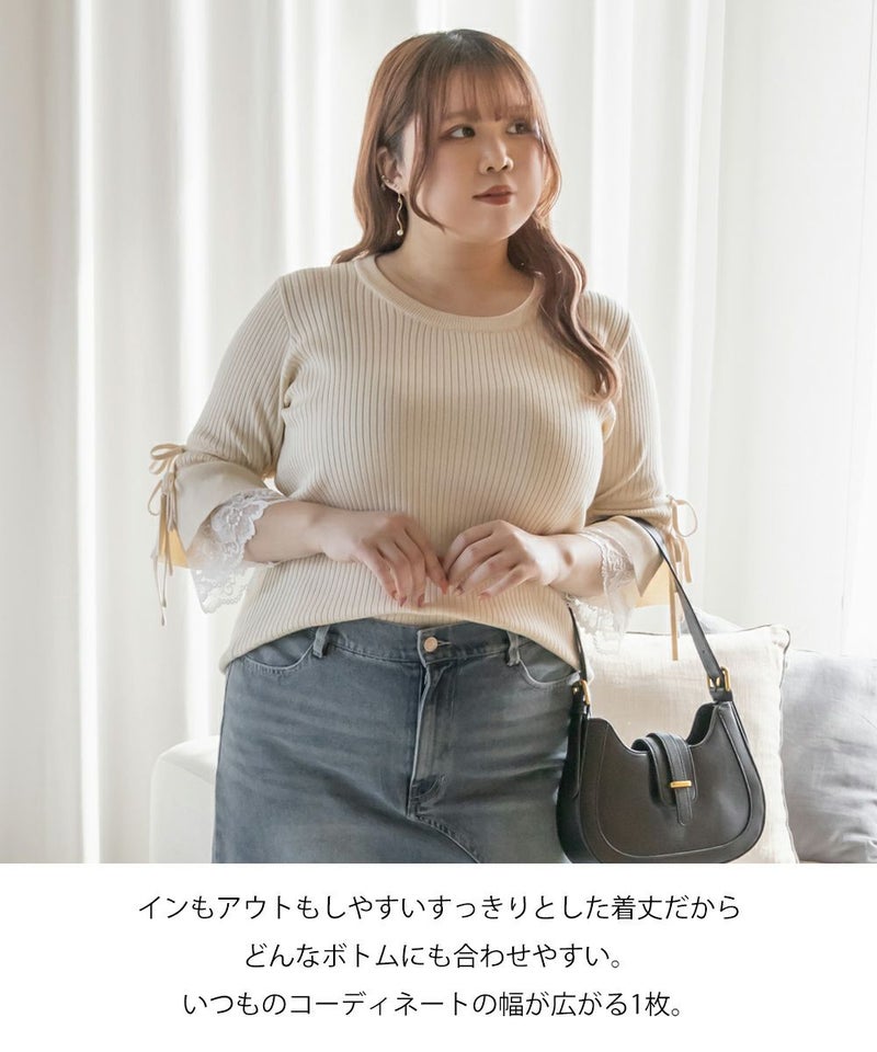 3Lサイズを着用してちょうどいいサイズ感でした。伸縮性の良いニットで着心地ラクチンでした◎リブニットなのですっきりとした印象だし、少し凹凸感もあるのでボディラインを拾いにくいのもポイントです。袖にレースとリボンがついていてとっても可愛いです♪トップスとして1枚で着てもいいし、首元などはシンプルなのでキャミワンピなどど重ねてもいいと思います!7分袖くらいなので手首に抜け感があって野暮ったくならずに着用出来ました!春にピッタリのフェミニンなニットプルオーバーです。