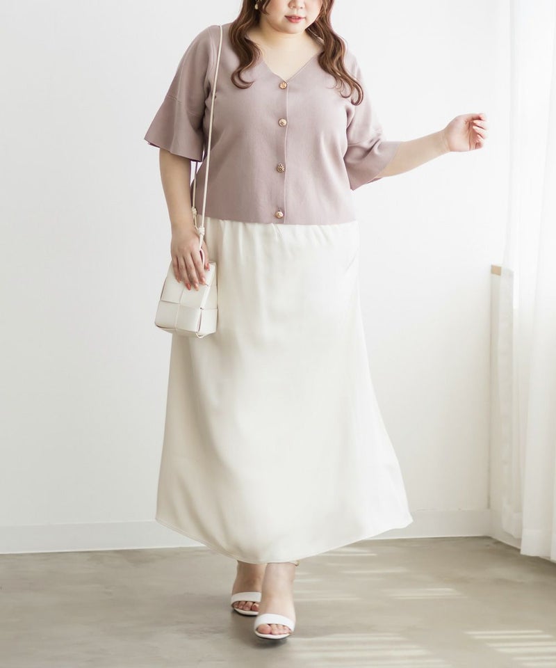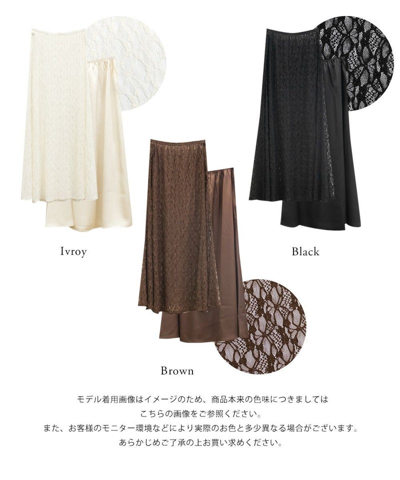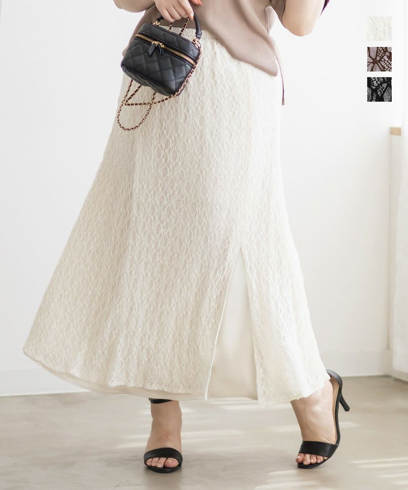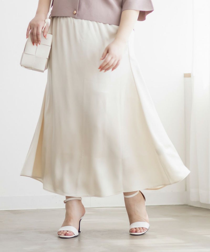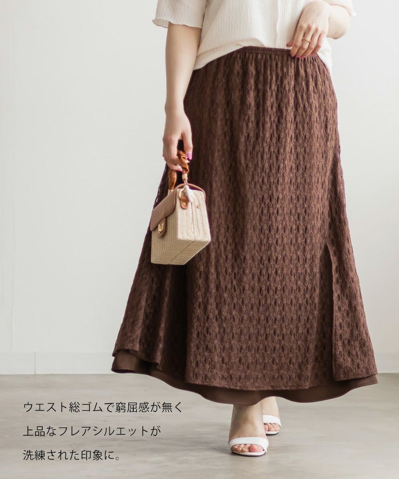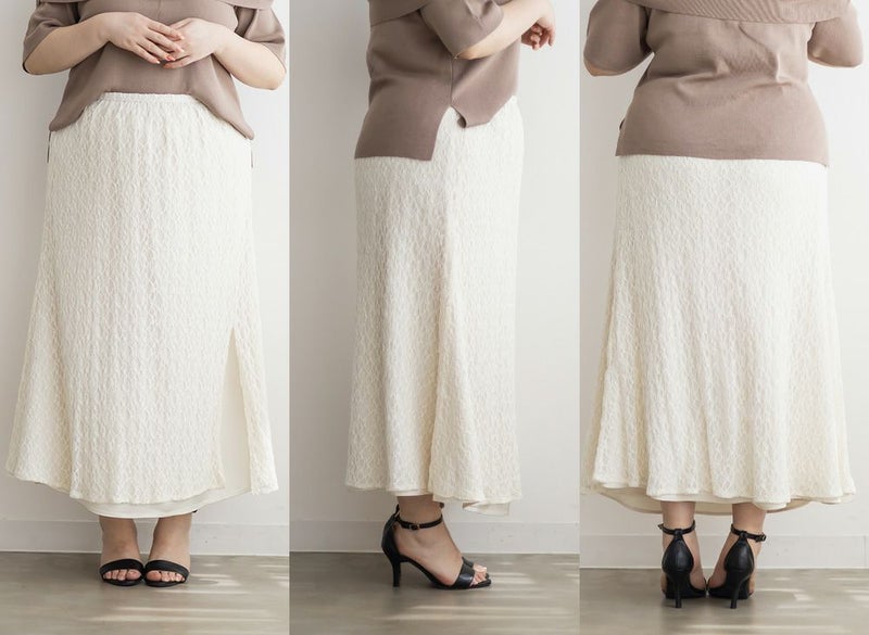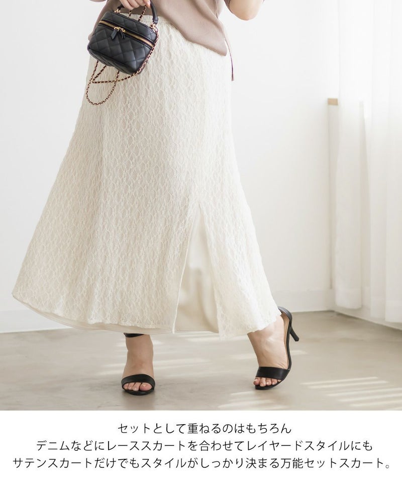 3Lを着て、ちょうどいいサイズ感でした。ウエストは総ゴム仕様で穿き心地もらくちんでした◎着丈も足首くらいのバランスでちょうどいいです!レースを前にして2枚で着用したり、サテンスカート単品で使ったり、レーススカートのみでパンツなどとレイヤードしたり、どのパターンも大人可愛く決まるので、気分で使い分けたいです♪レーススカートは総レースで上品さもあって、スリット入りでチラッと重ね着が見えるのもポイントです◎サテンスカートは、ツヤ感も綺麗できちんと感のある着こなしにもマッチします!1セットあると大活躍するスカートは1枚持っておくと本当に便利!