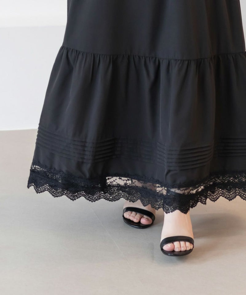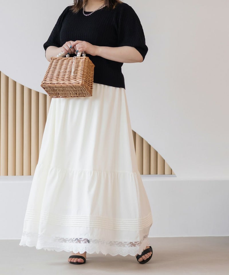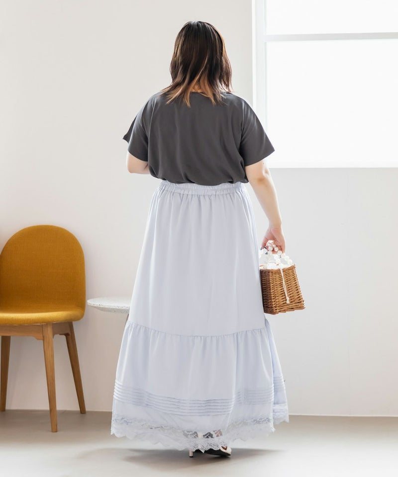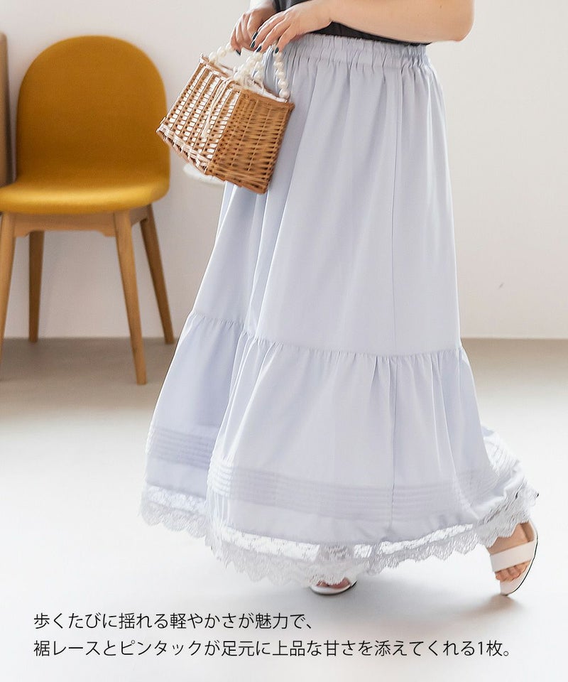 LLサイズをきてらくちんな着心地でした。ウエストは総ゴムで、ほどよくフィットしながらラクに履けて動きやすいです◎程よく落ち感のある生地で広がりすぎず、綺麗なフレアシルエットです!裾のピンタックとレースがとっても上品で、フェミニンな着こなしももちろん、カジュアルコーデでも大人っぽくまとまります♪ブラウスと合わせればきれいめに、ロゴTと合わせれば抜け感のある可愛さも楽しめて、着回し力もばっちりです!年中使える生地感・デザインなので、たくさん着回したいアイテムです!