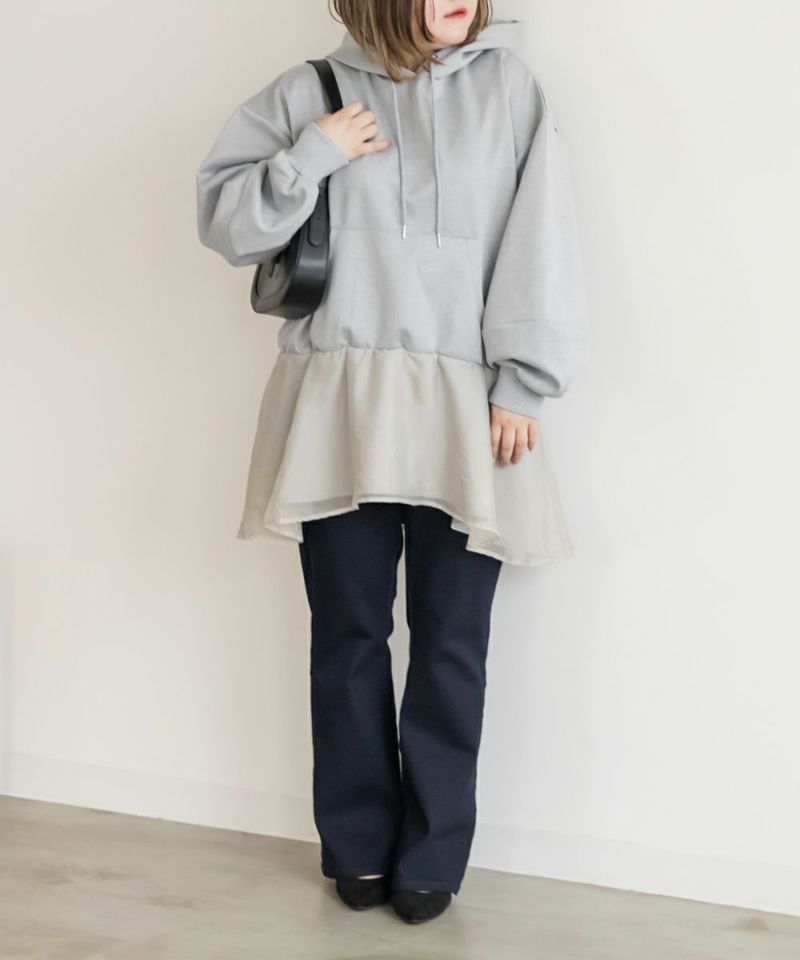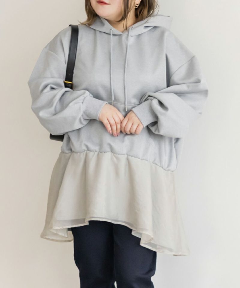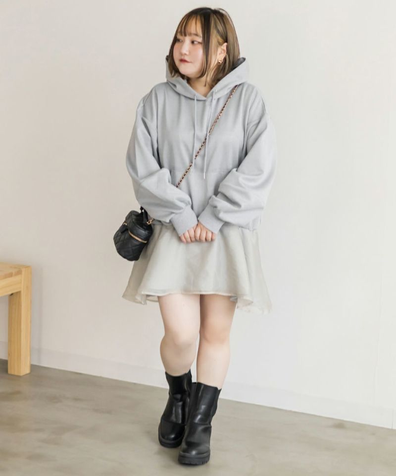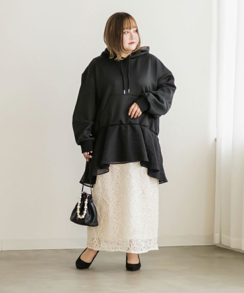 3Lサイズを着用して、ゆとりのあるサイズ感でした。ゆったりとしたオーバーシルエットで、気になる体のラインを自然にカバーしてくれます!裾部分のシアー素材の切り替えデザインがポイントになって可愛い♪ふんわり広がるペプラムシルエットがメリハリをプラスしてくれます◎ヒップがすっぽり隠れる丈感で安心感があり、スリムパンツやレギンスとの相性も抜群です!