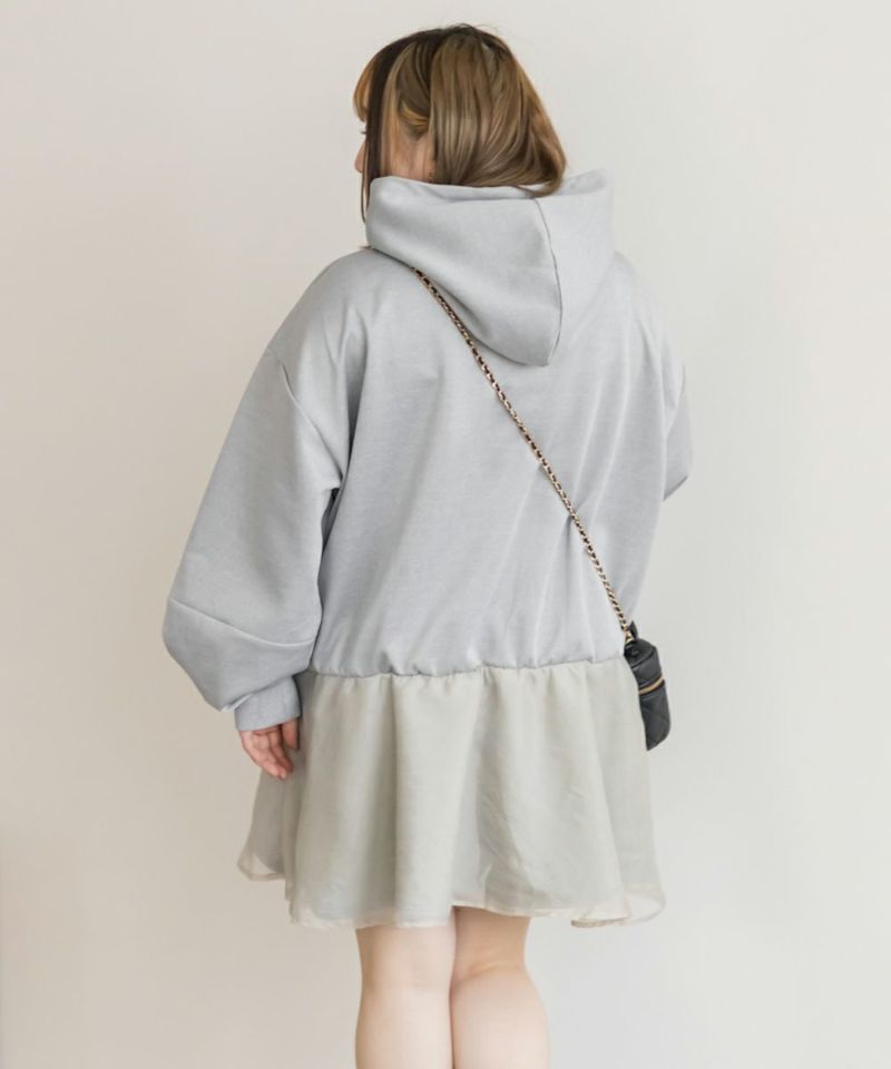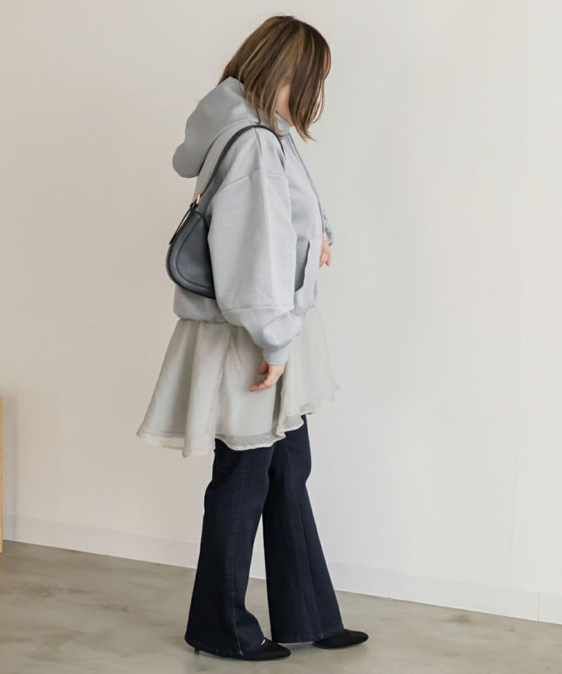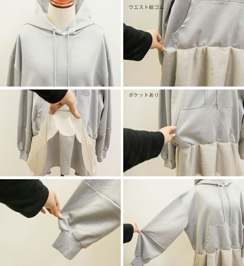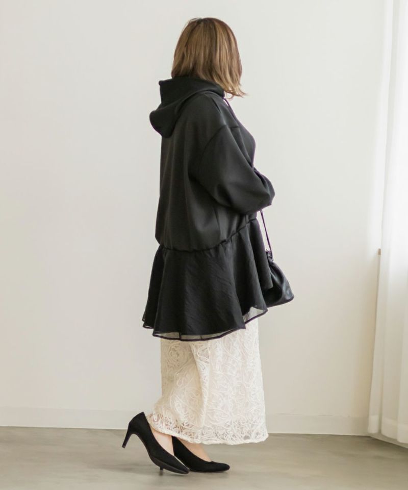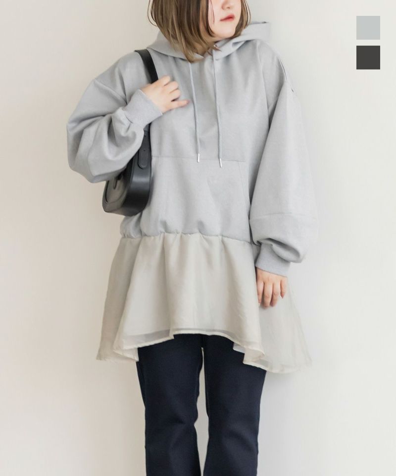 3Lサイズを着用して、ゆとりのあるサイズ感でした。ゆったりとしたオーバーシルエットで、気になる体のラインを自然にカバーしてくれます!裾部分のシアー素材の切り替えデザインがポイントになって可愛い♪ふんわり広がるペプラムシルエットがメリハリをプラスしてくれます◎ヒップがすっぽり隠れる丈感で安心感があり、スリムパンツやレギンスとの相性も抜群です!