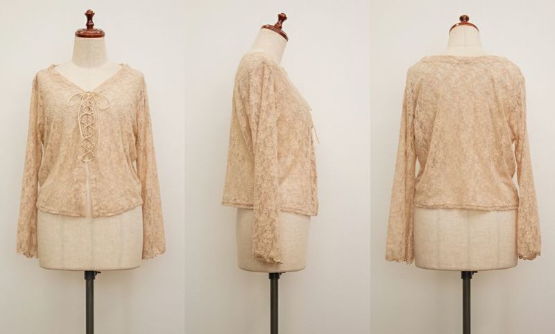 3Lサイズを着用しました。ピッタリの着心地でした!程よい透け感のフラワーレースが華やかで、胸元のレースアップデザインが女性らしさを引き立ててくれます。伸縮性も少しあって着心地も楽なのに、しっかりとフェミニンに見えるのが嬉しいポイント♪ デニムやスカートに合わせやすい短めの丈感でバランスよく着られて、コーデの主役になってくれる一枚です◎