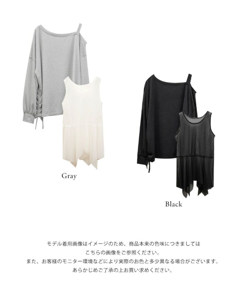 3Lサイズを着用しました!トップスはカットソー生地なのと、インナーはチュールで軽く少し伸びる生地なのでとってもラクな着心地です◎ トップスの両サイドはブラウジング出来て、リボン結びも可愛いし、お好きな丈感に少し調節できます!らくちんな着心地ですが、ワンショルデザインとレイヤードセットになっていて野暮ったくならず洗練された印象。インナーは程よく丈があるので下お腹周りも自然にカバーしてくれすっきり見えします!ラフなのに女っぽさ満点の1枚で、お出かけにぴったり!もちろんトップス・インナーは別で着回しできるので、色々なスタイリングが楽しめます♪