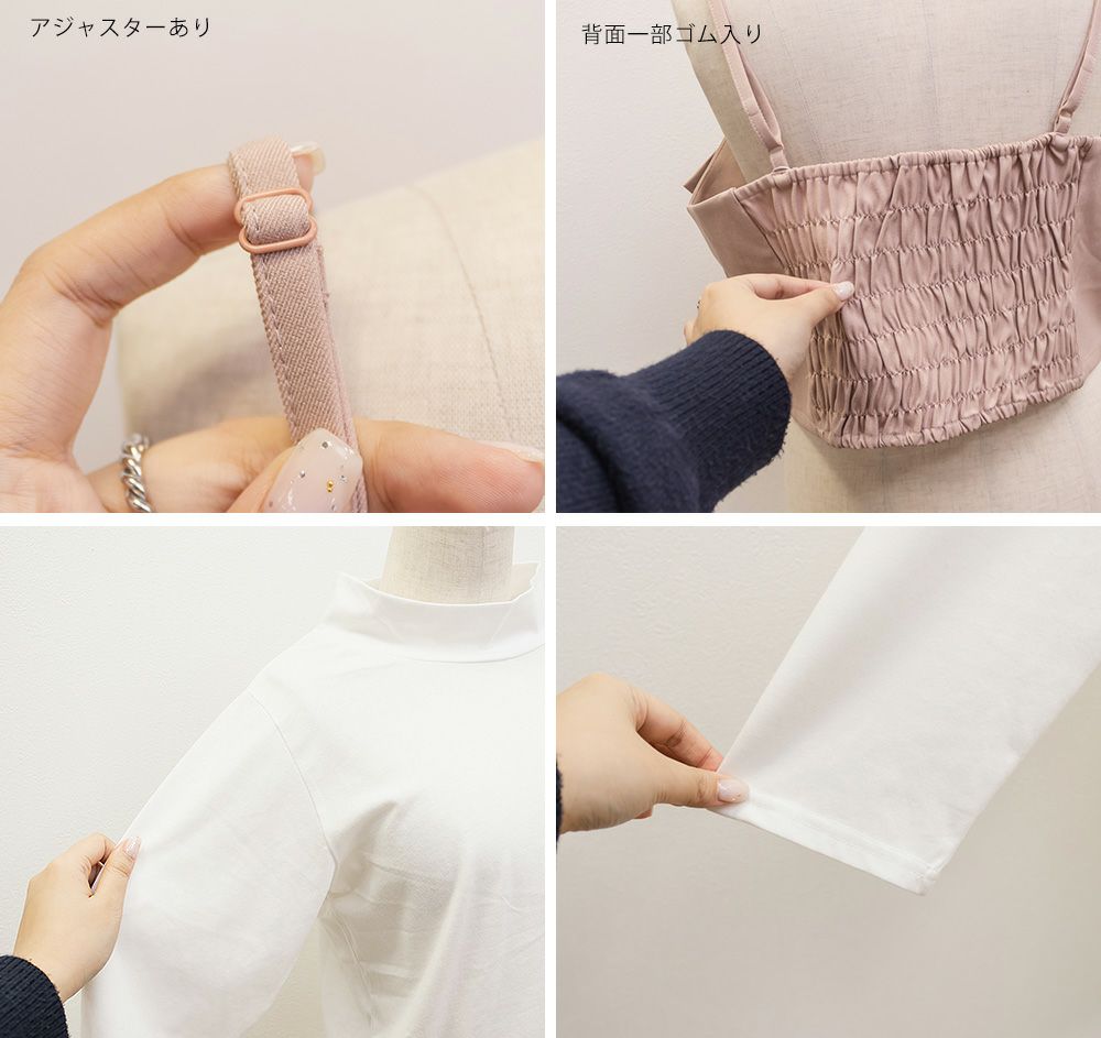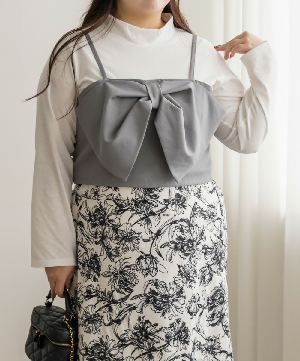 3Lサイズを着用していつもどおりのサイズ選びで問題なさそうでした!ビスチェは後ろゴム入りだけど生地自体は伸びないのでバストサイズの確認をお勧めします◎トップスとビスチェのセットでそれぞれ別のアイテムと合わせて着ても可愛いです!トップスはリブカットソーでらくちんな着心地です!大きめのリボンが目を惹くアイテムで、ガーリーなスタイルになれちゃう1枚です!ビスチェと同じ生地のパンツとセットアップで着てもお洒落な雰囲気になれてお勧めです♪