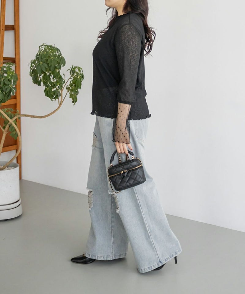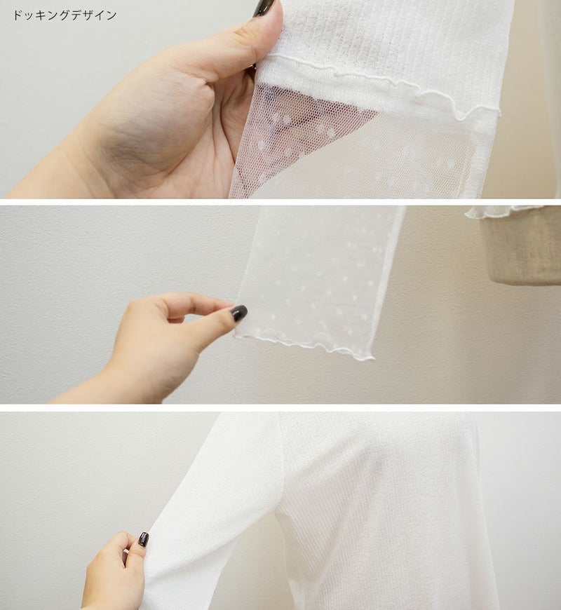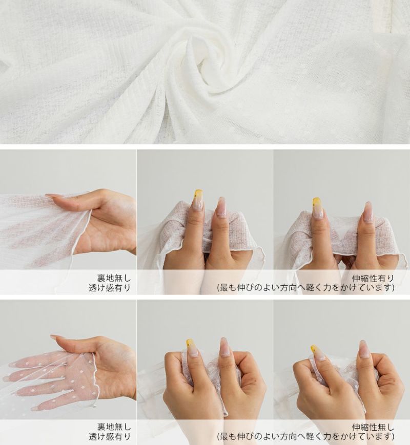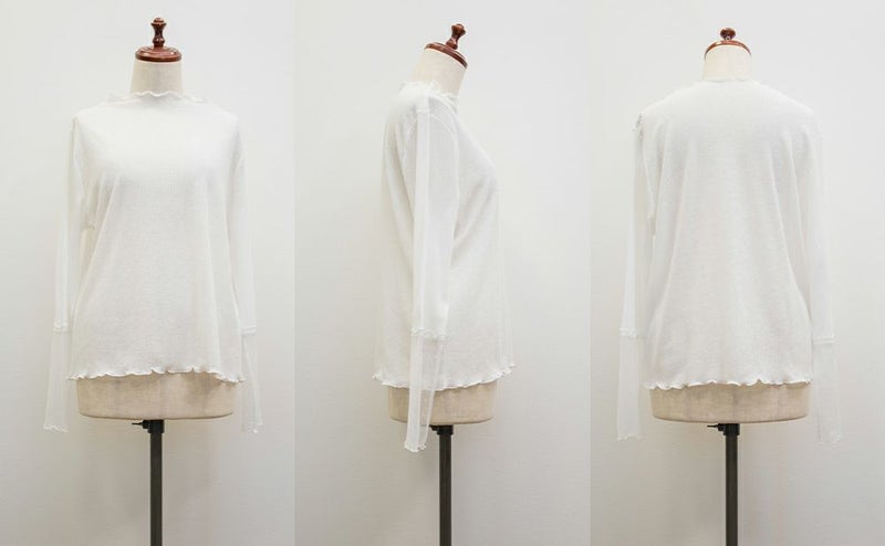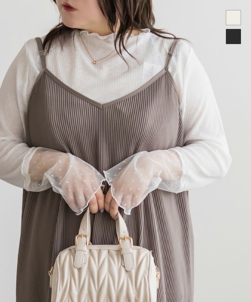 3Lサイズを着用しました!着用感はちょうどいいです◎袖口がドットになっていて手元が可愛い印象です!シアー素材ならではの軽やかさが女性らしい印象にしてくれます♪ほどよい透け感なので、キャミやタンクを合わせてレイヤードを楽しめるのもポイント。もちろんトップスとして使えて、ロングシーズン着回しできるのも嬉しい!メロー仕立ての縁がさりげないアクセントになり、シンプルながらトレンド感のあるトップスです◎