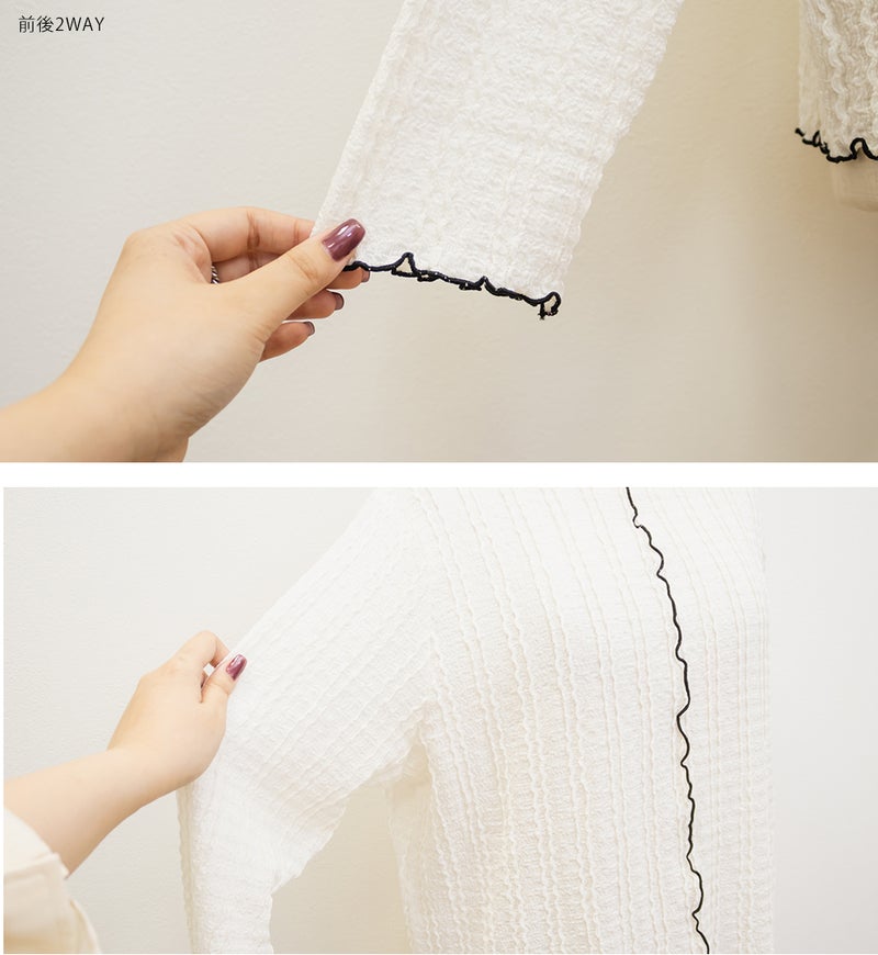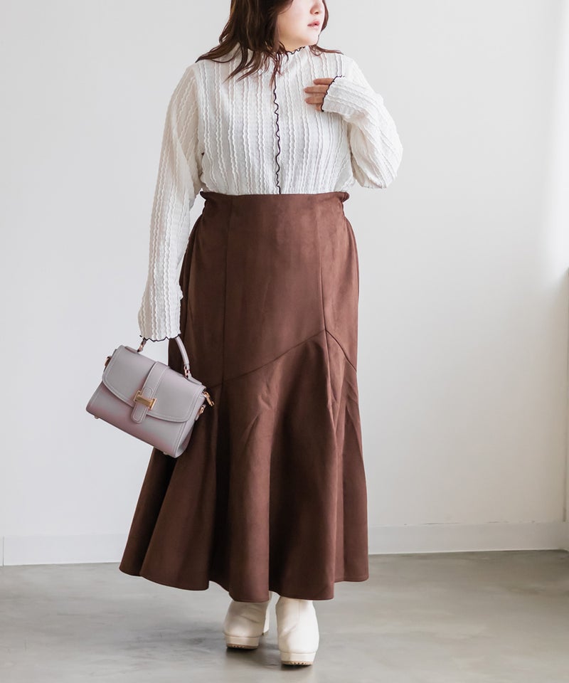 3Lを着てゆとりがありました。ぽこぽこ感のある生地が伸縮性もあってラクチンな着心地です◎配色メローデザインで甘く・子供っぽくならずにおしゃれな雰囲気で着られてメリハリのある印象です。プチハイになっているのも大人っぽくて可愛いです!ボディラインも拾いづらい生地感なのでトップスとしても着用できます。レイヤードのインナーとしても使い勝手がいいからあると便利なプルオーバーです♪