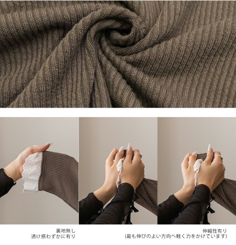 3Lサイズを着用してちょうどいい着心地でした。秋冬らしい雰囲気になれる生地だけど、薄手なので、ごわつかず重ね着もしやすいです!ネックや袖口からチラッと見えるレースが可愛くてトップスとしても重ね着してもお洒落な印象です♪リブの縦ラインがあるので華奢見えも叶います!ジャケットのインナーにしてもワンピのインナーにしても可愛いプチハイネックで、たくさん着回しの効く1枚です!