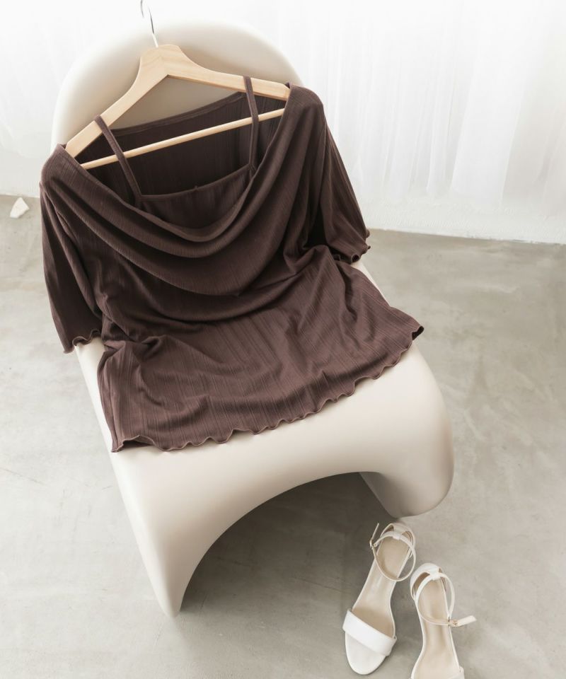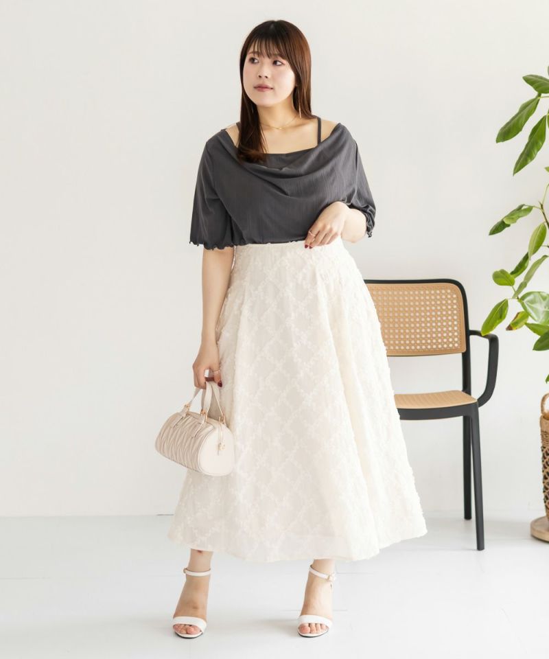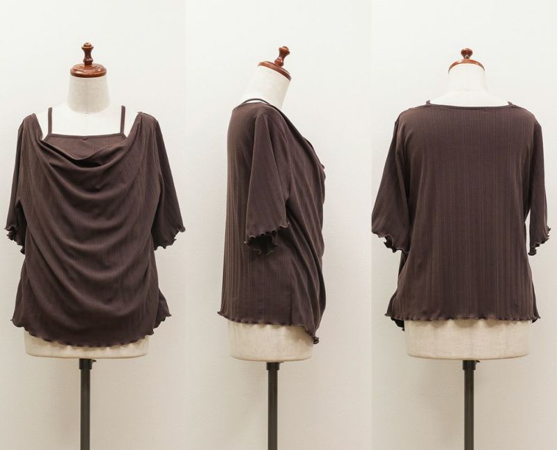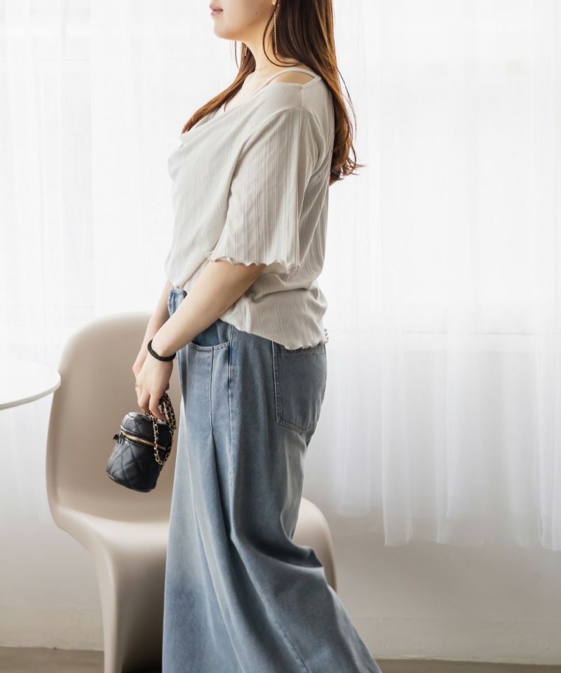3Lサイズを着用して、身幅も袖まわりも程よくゆとりがあり、ちょうどいいサイズ感でした! 柔らかく軽いリブ素材がリラックス感たっぷりで、程よくゆとりのあるシルエットなので体のラインを拾いにくく、さっと着るだけでサマになります♪ キャミをレイヤードしたようなデザインで、インナーを気にせずに着用出来て、1枚でお洒落な雰囲気を楽しめるのも嬉しいポイント!タックインしなくても可愛いメローっぽい裾になっているので、パンツとの相性も抜群!1枚で大人っぽくこなれ感があるのに、夏にピッタリな着やすい素材でたくさん着ていきたいアイテムです◎