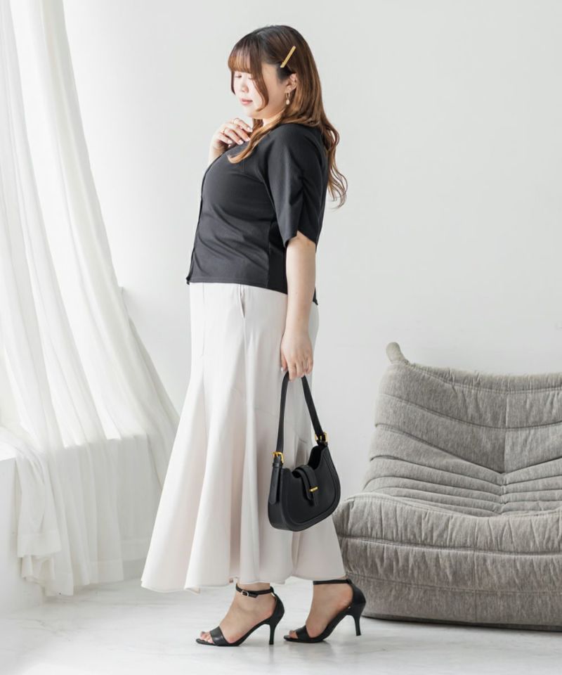 3Lを着て丁度良いサイズ感でした。程よくゆとりを持って着られるサイズ感で、締めつけ感もなく快適な着心地です。デコルテがすっきり開いたネックラインで、シンプルながらも着映えする1枚です!カットソー素材で伸縮性もあり、動きやすくてストレスフリーなのもうれしい◎さらっとしたリブ素材なので真夏でも過ごしやすいと思います♪スカートにもパンツにも合わせやすい丈感で、デイリーに活躍してくれそうです!前は開く仕様になっていて着脱も楽だし、羽織としても使えそうです!シンプルなボトムでも、デニムでも合わせやすくTシャツ感覚で着られる1枚です。