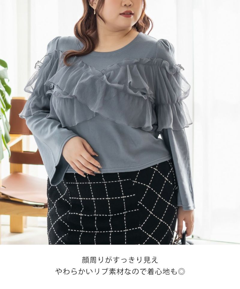 3Lサイズを着用してちょうどいいフィット感で、リブ素材なので体に沿いながらも動きやすかったです!胸元のクロスチュールデザインがポイントになっていて、大人可愛い抜け感を演出してくれます♪生地はしっかり伸びるので、ストレスフリーな着心地でした。裾はインでもアウトでもバランスが取りやすい短め丈で、パンツにもスカートにも合わせやすい万能トップスです!シンプルになりがちなコーデに取り入れるだけで華やかになれるトップスです◎
