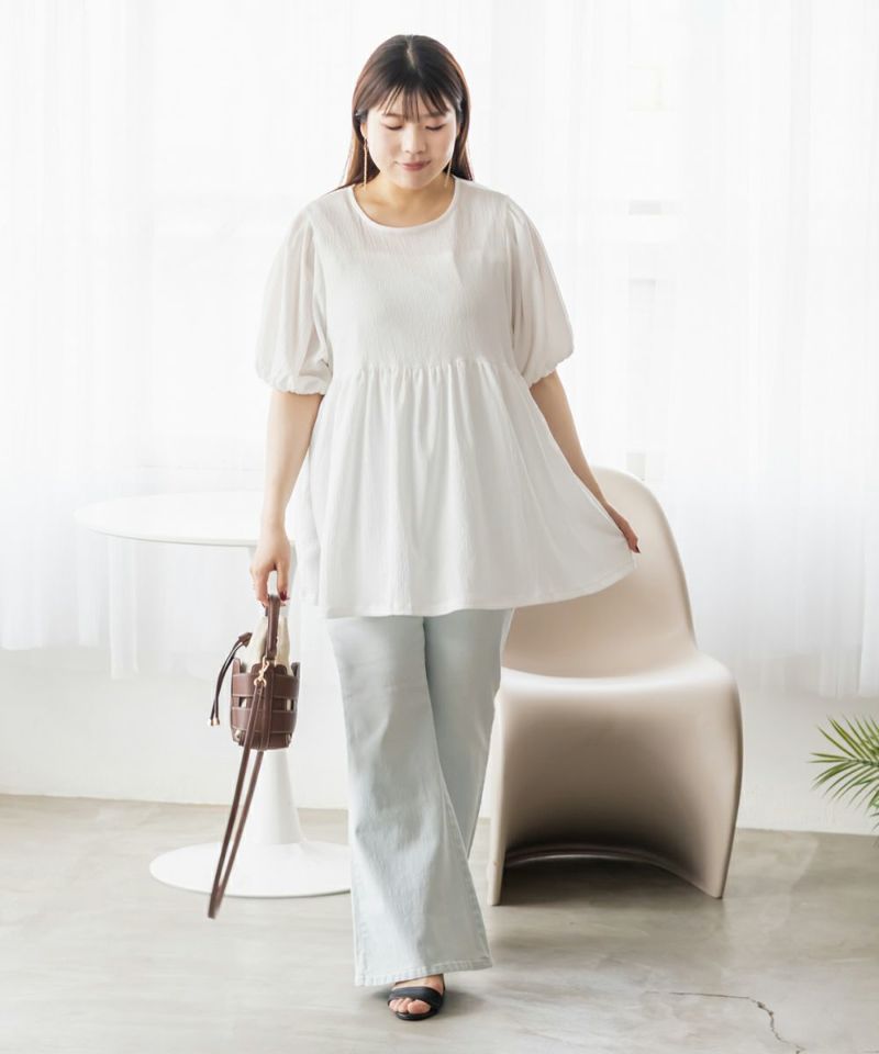 3Lサイズを着用してちょうどいいサイズ感でした。やわらかくらくちんな伸縮性のある生地で着やすいのが嬉しいです◎気になる部分をカバーしてくれるシルエットもポイントで、すっきりとしたシルエットのボトムと合わせて大人っぽくスタイリングしたい1まいです♪着丈も長めなのでお尻まですっぽりカバーしてくれます!シワ感のある生地が可愛く、涼しく着用出来てお出かけなどにお勧めです!