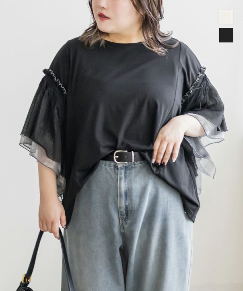 3Lサイズを着用しました。窮屈感なくちょうどいいサイズ感でした◎見頃は着心地の良いカットソーで見た目以上にらくちんな着心地です!袖が3層に重なったデザインで、ふわっと広がるフレアスリーブが動くたびに揺れて、フェミニンな雰囲気をしっかり演出してくれます♪きちんと感があるのに着心地はラクなので、お仕事からお出かけまで幅広く活躍してくれそうです。スカートでもパンツでもバランスよく決まる丈感で、着回し力も高めです!