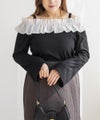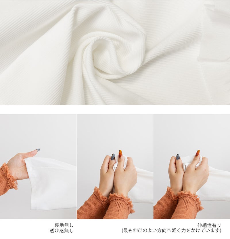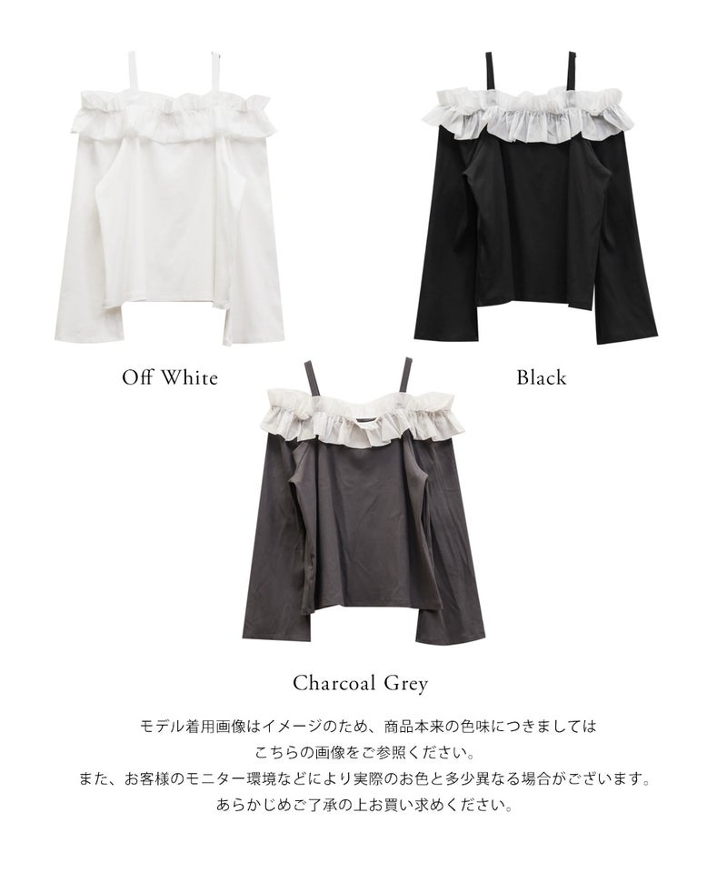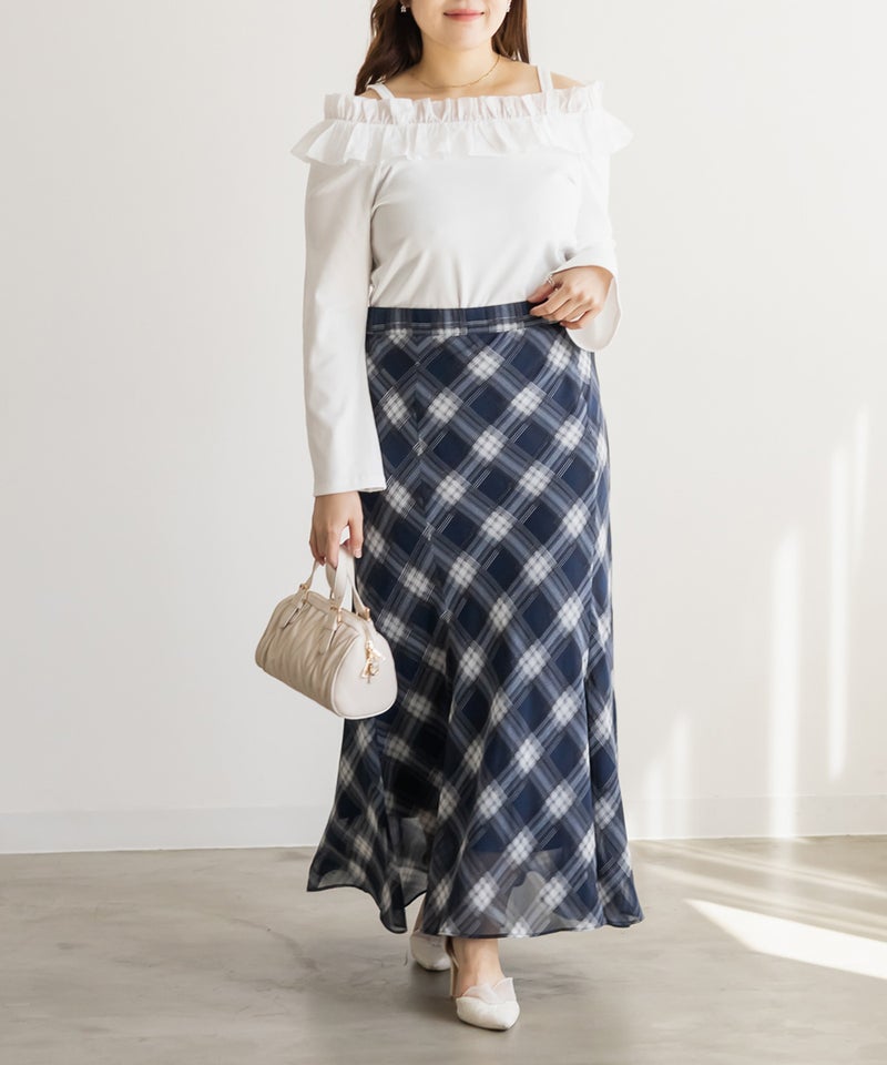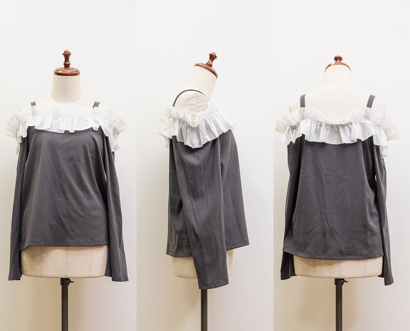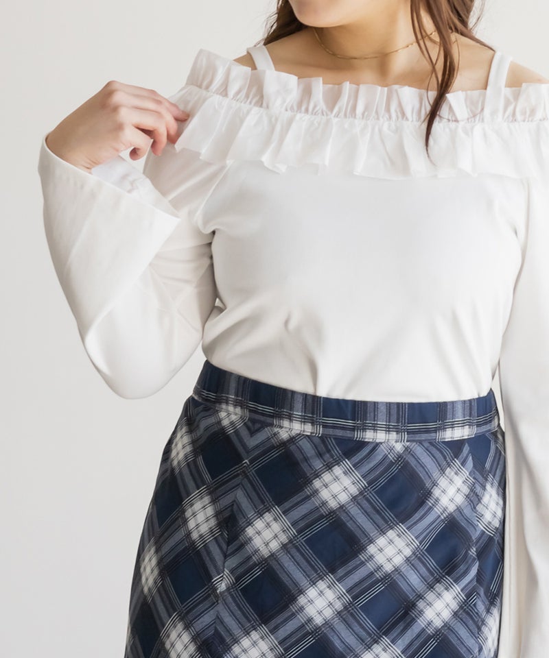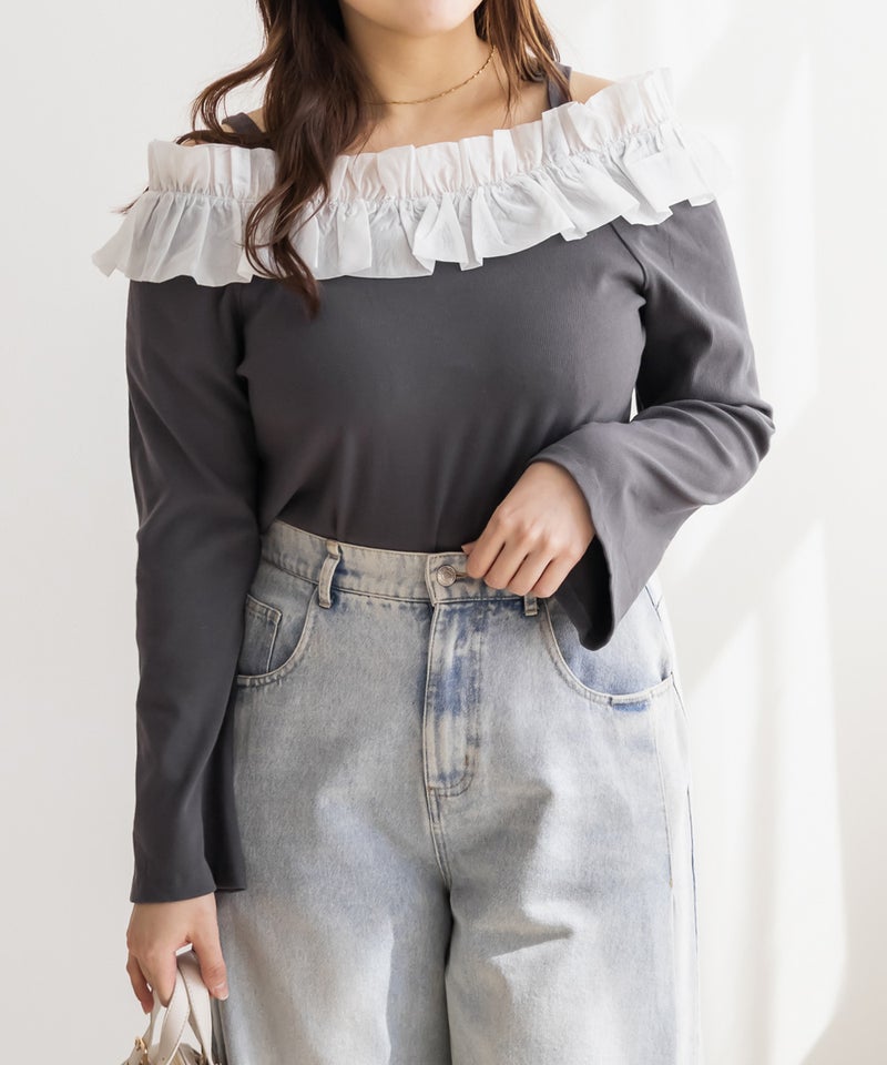 3Lを着用してちょうどいいサイズ感でした。程よく薄手のカットソーで伸びもあってとても楽に着られました!デコルテがすっきりと開きながら、下着の肩紐が見えないようなデザインになっているのがポイントでインナーに困らないのが嬉しいです。女性らしい肌見せが叶う1着です◎胸元のフリルはフェミニンさとメリハリをプラスしてくれて、とってもかわいいです♪袖先は少しフレアに広がっていて手元もおしゃれで可愛いです。丈はタックインせずに着られるのでパンツともスカートも相性のいいので、1枚持っておきたいトップスです!