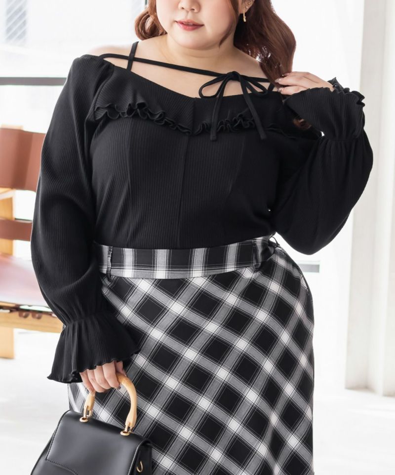 3Lを着て軽やかなリブ生地で、肌離れもよく快適に着られます。デコルテのリボンはネックラインにメリハリをプラスして、女性らしく可愛い印象になります♪オフショル・オンショルどちらでも着られる2WAY仕様で、その日の気分やコーデに合わせて印象を変えられるのが嬉しいポイントです。顔回りにさりげないフリルがあって程よく華やかさをプラスしてくれて、1枚で大人フェミニンな雰囲気に仕上がります。動きやすく、インでもアウトでもバランスよく着こなせました◎