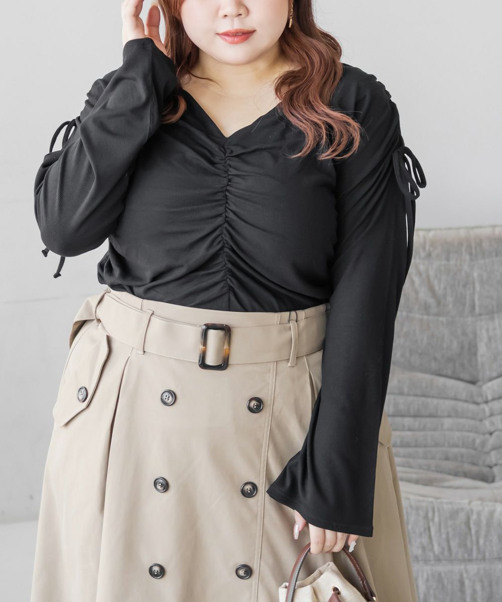 3Lサイズを着用して、ちょうどいいサイズ感で着られました。生地自体がやわらかく伸縮性もあって、肌当たりも優しいカットソーです。ギャザーが立体感を出してくれて、シンプルなのに華やかに見えるデザインです◎程よくフィット感がありながら、ギャザーが体のラインを拾いにくいのもうれしいポイント!1枚で決まるから、裾出しでデニムやスラックスと合わせるだけでもバランスよくスタイリングできます。