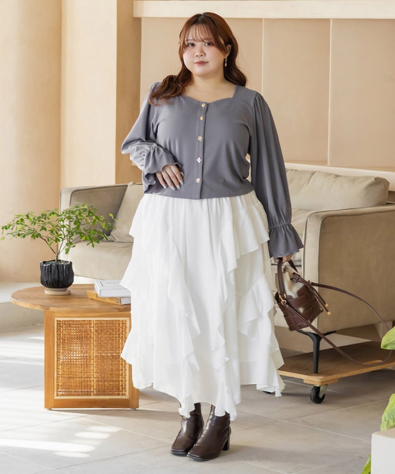 3Lサイズを着用してサイズ感はゆとりがあってピタッとしすぎないのが嬉しいです♪フロントに並んだマルチデザインのボタンが、コーデにさりげなく遊び心をプラスしてくれて可愛いです◎シンプルながらもアクセントが効いていて、コーデが華やかになります!生地はらくちんなカットソーで肌あたりも心地よかったです。丈感は裾を出してもちょうどよく、パンツにもスカートにもバランスよく合わせられました。