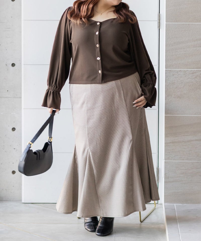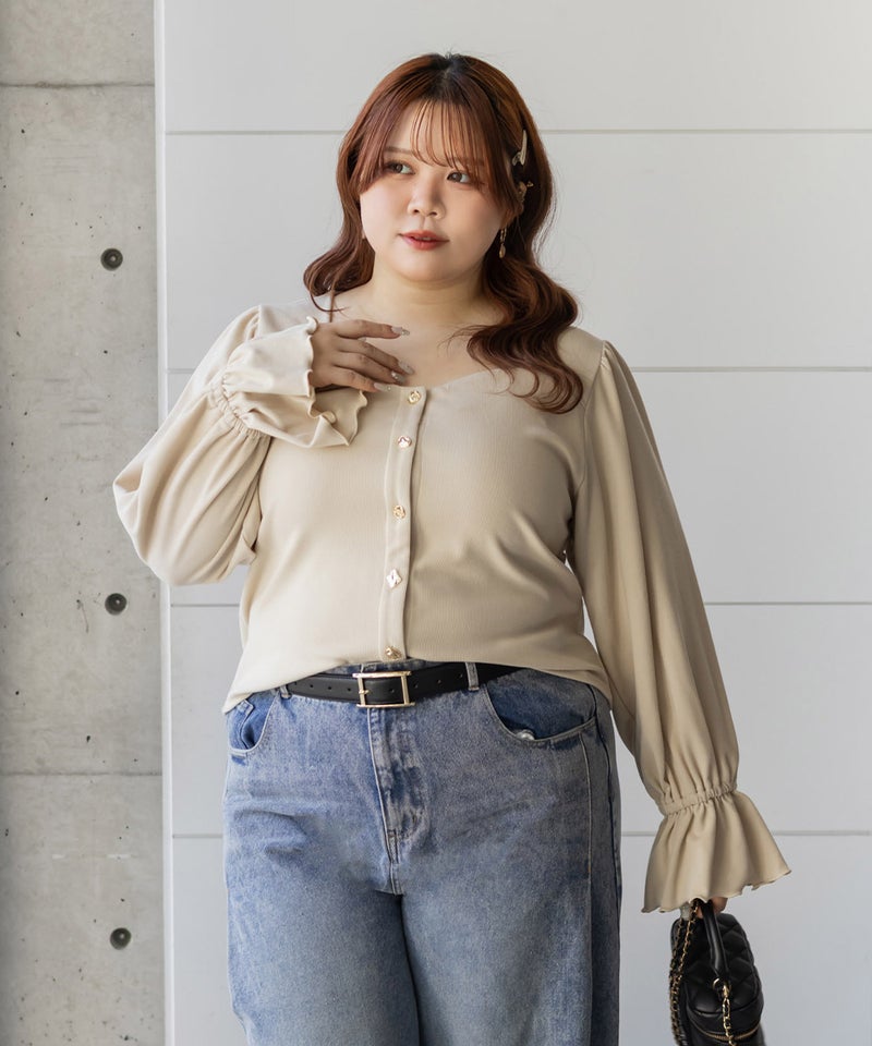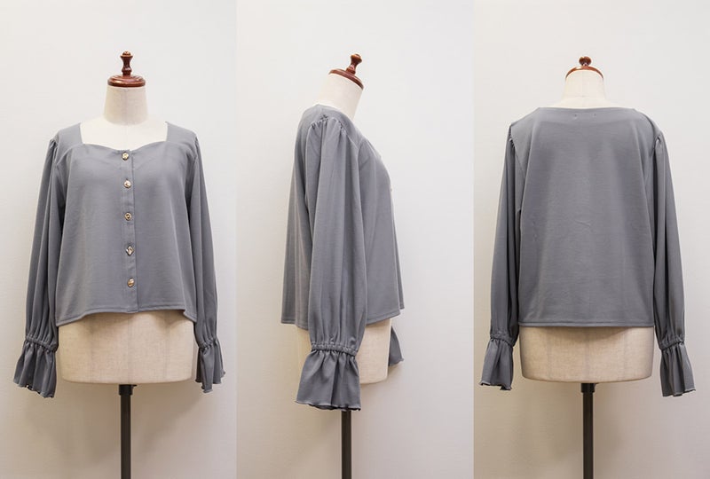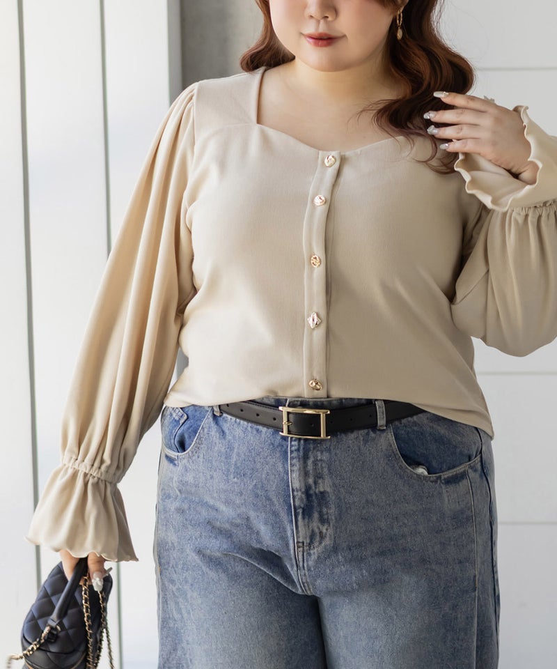 デザインちがいのアソートボタンが遊び心のあるフェミニンなプルオーバー。すっきりとした印象のスクエアネックと二の腕をカバーしつつ手元を華奢見せするキャンディースリーブで着やせ効果もアップ。