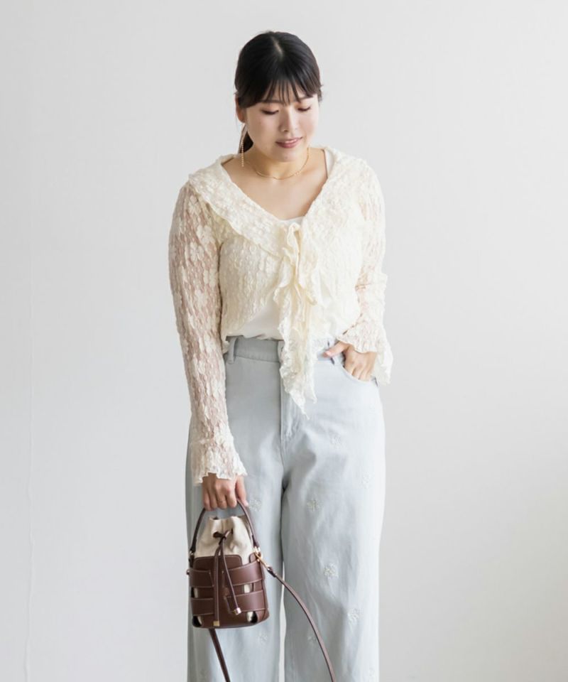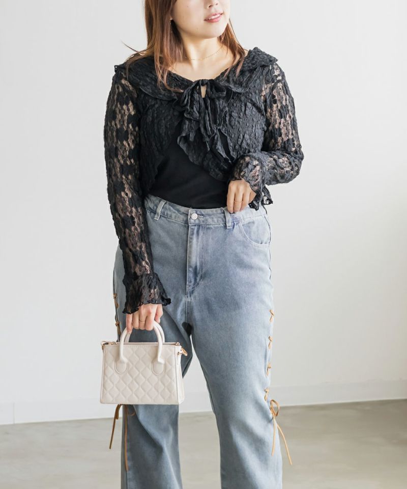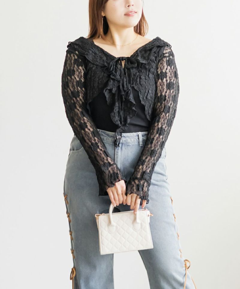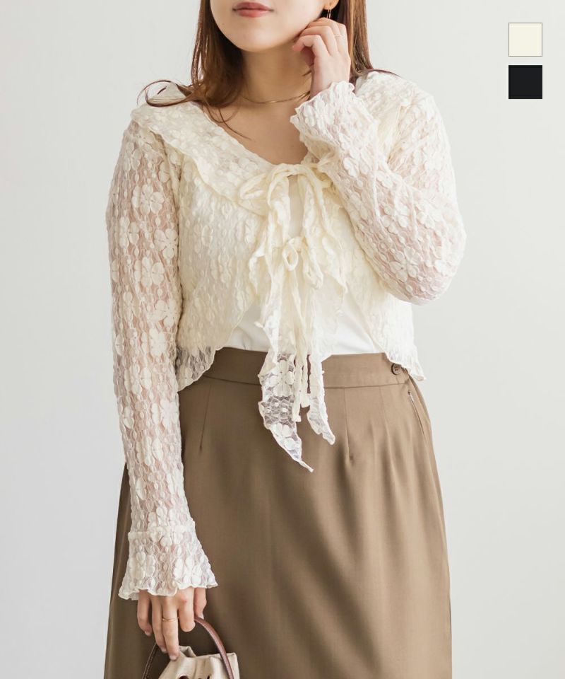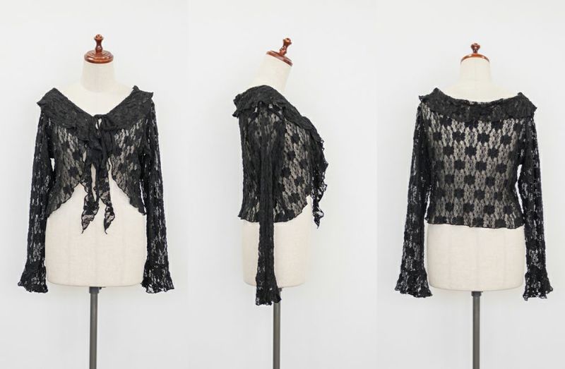 レースの透け感が上品で、春夏の冷房対策や日差しよけにもぴったりな1枚です。秋冬は中にロンTやハイネックのインナーを合わせても◎