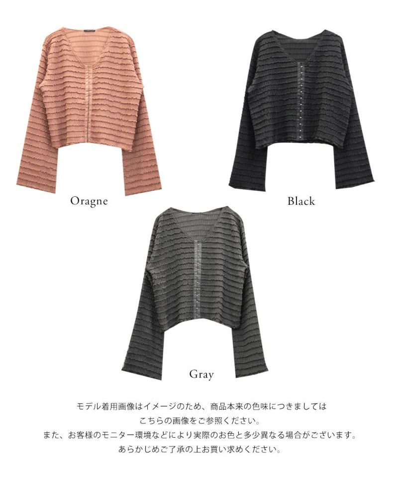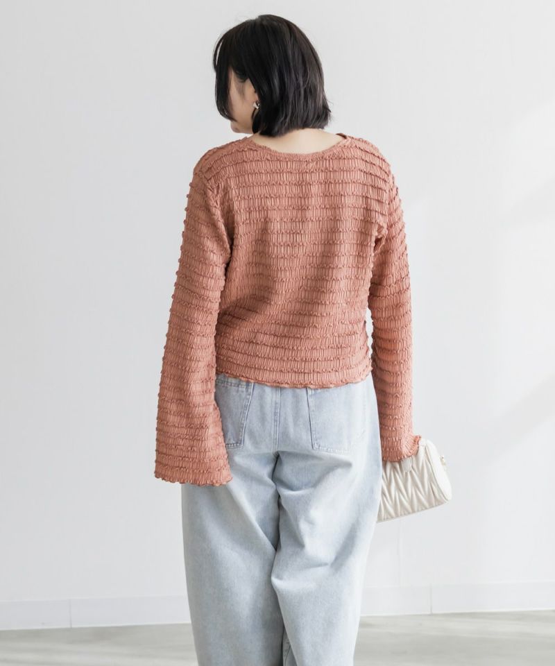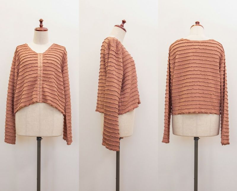 3Lサイズを着用してちょうどいいサイズ感でした。すっきりシルエットのLLサイズを着て、トップスですがピタッとせず程よくゆとりを持って着られました。軽くて伸びある生地で窮屈感なく着られました!フロントのホックが今っぽいデザインで、縦のラインが強調出来て着やせして見えます!ネックラインはVネックに綺麗に開いていて、詰まった印象が無くすっきり見えするのが嬉しいです!生地がポコポコしていて、大人カジュアルにスタイリングできるデザインになっています◎丈感も絶妙でインしなくてもコーデしやすいのもポイントです!秋~春とながく使えるトップスなのであると便利な1枚です!