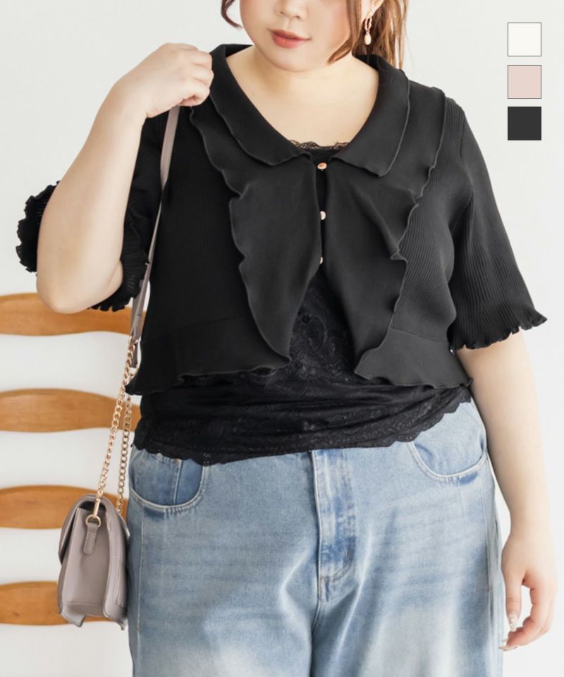 3Lサイズでぴたっとしすぎず、心地よい着用感でした。もっちりとしたサマーニットでハリがあり、ボディラインも拾いずらいです◎フリルの衿が顔まわりを華やかに見せてくれて、羽織るだけで一気にフェミニンな印象に♪短めの丈感なので、ワンピースやスカートと合わせてもスタイルアップして見えます!トップスっぽく着てもいいし、羽織にしても可愛いデザインなのでたくさん着回ししたくなるアイテムです!