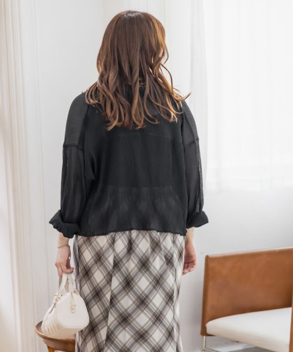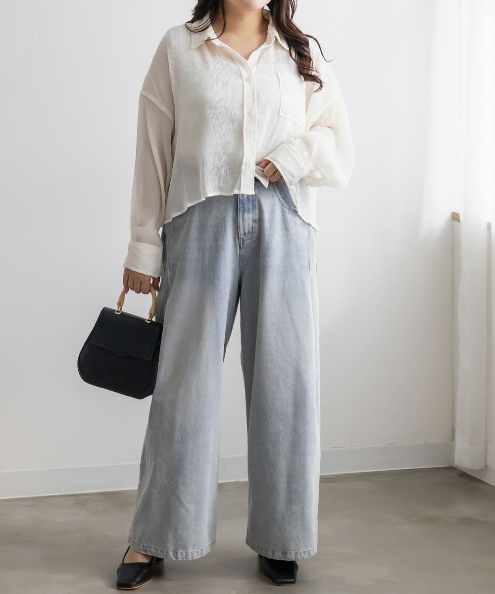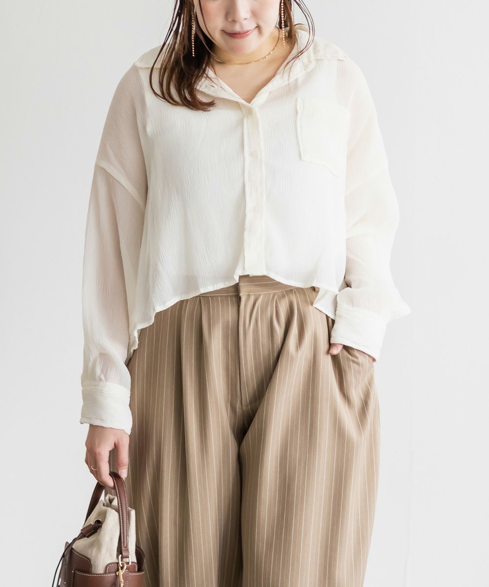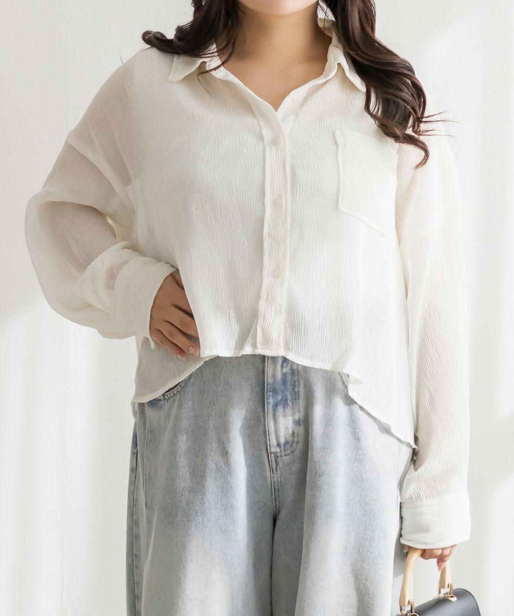 3Lサイズを着用しました。程よくゆとりがあって動きやすく、軽やかな着心地です!透け感が可愛いシアー素材で、少し楊柳っぽい凹凸の生地がかわいいです◎シアーの素材が上品で、カジュアルにもきれいめにも合わせやすい万能アイテムです。短丈なので、アウトしてちょうどよくスタイルアップして見えました!オールシーズン使いまわせるシャツはバリエーション違いでもっておきたいアイテムです♪