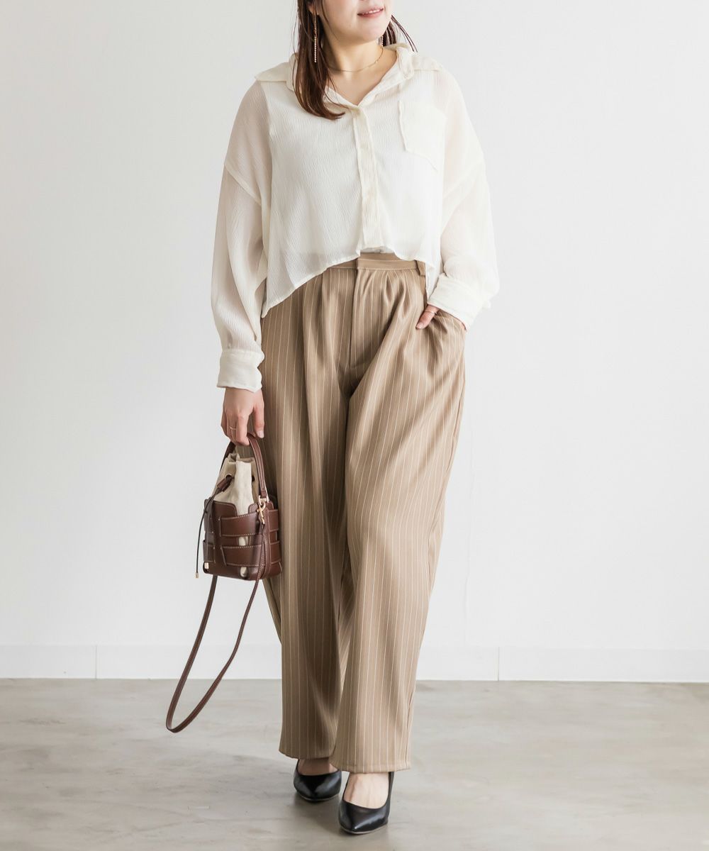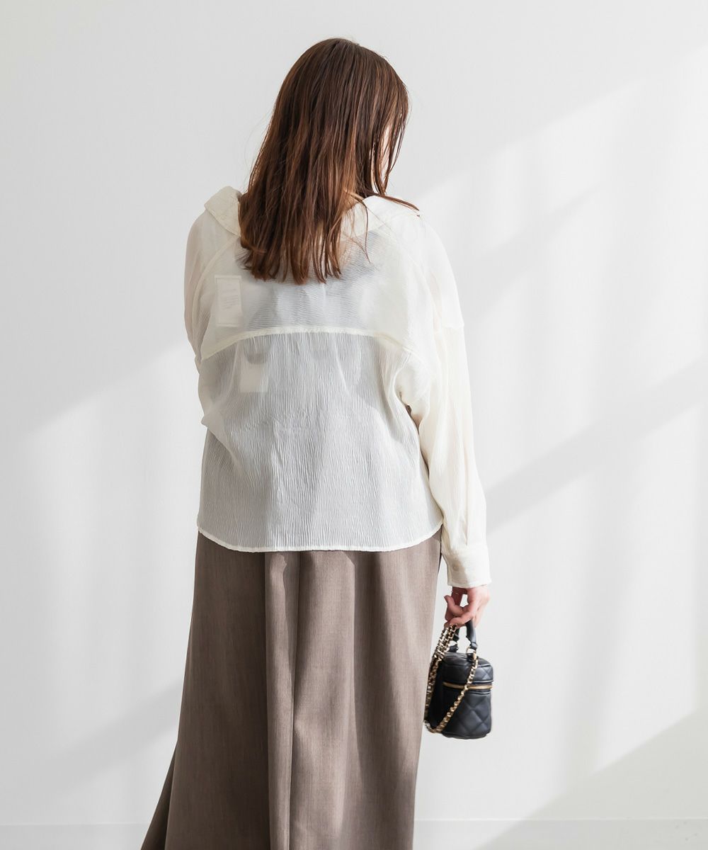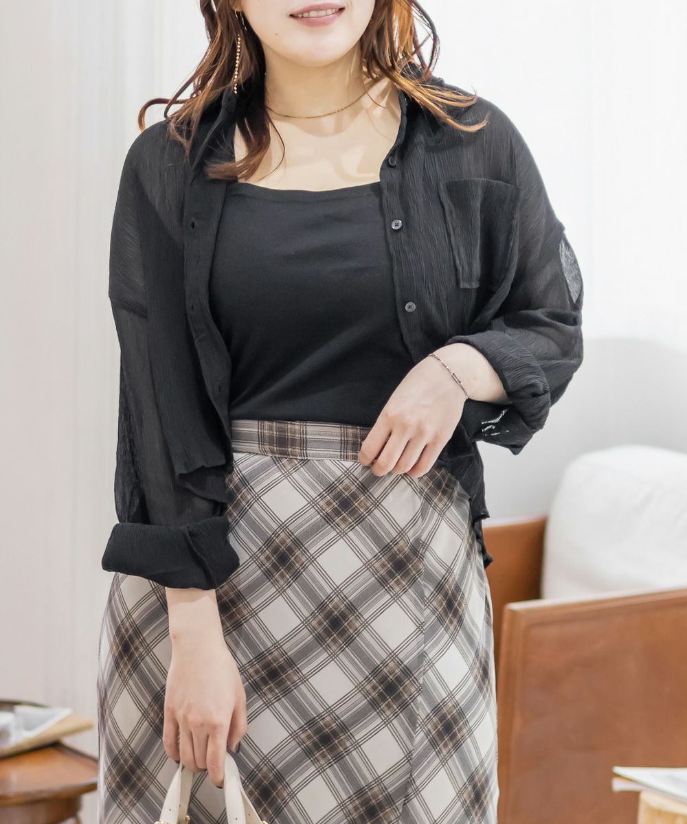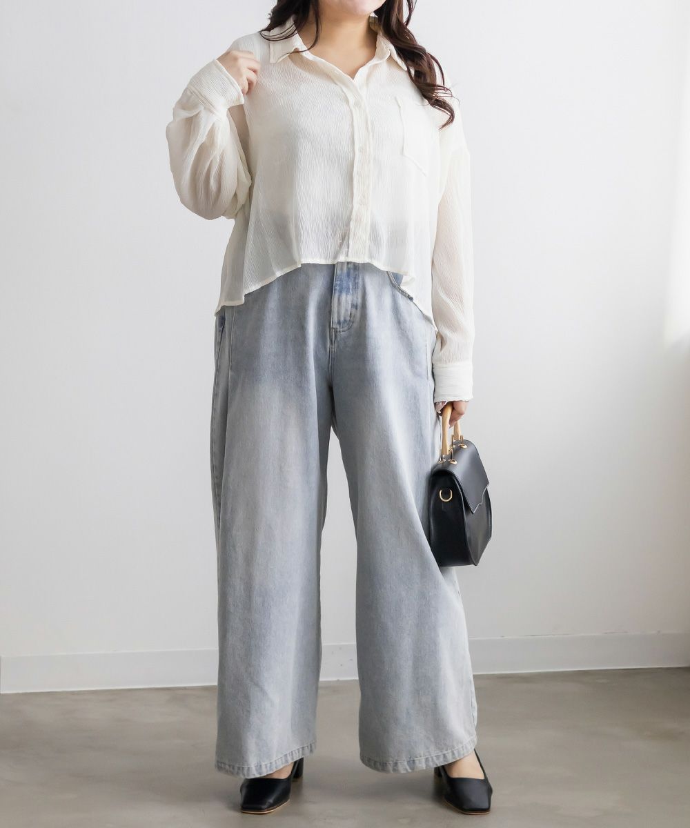 3Lサイズを着用しました。程よくゆとりがあって動きやすく、軽やかな着心地です!透け感が可愛いシアー素材で、少し楊柳っぽい凹凸の生地がかわいいです◎シアーの素材が上品で、カジュアルにもきれいめにも合わせやすい万能アイテムです。短丈なので、アウトしてちょうどよくスタイルアップして見えました!オールシーズン使いまわせるシャツはバリエーション違いでもっておきたいアイテムです♪