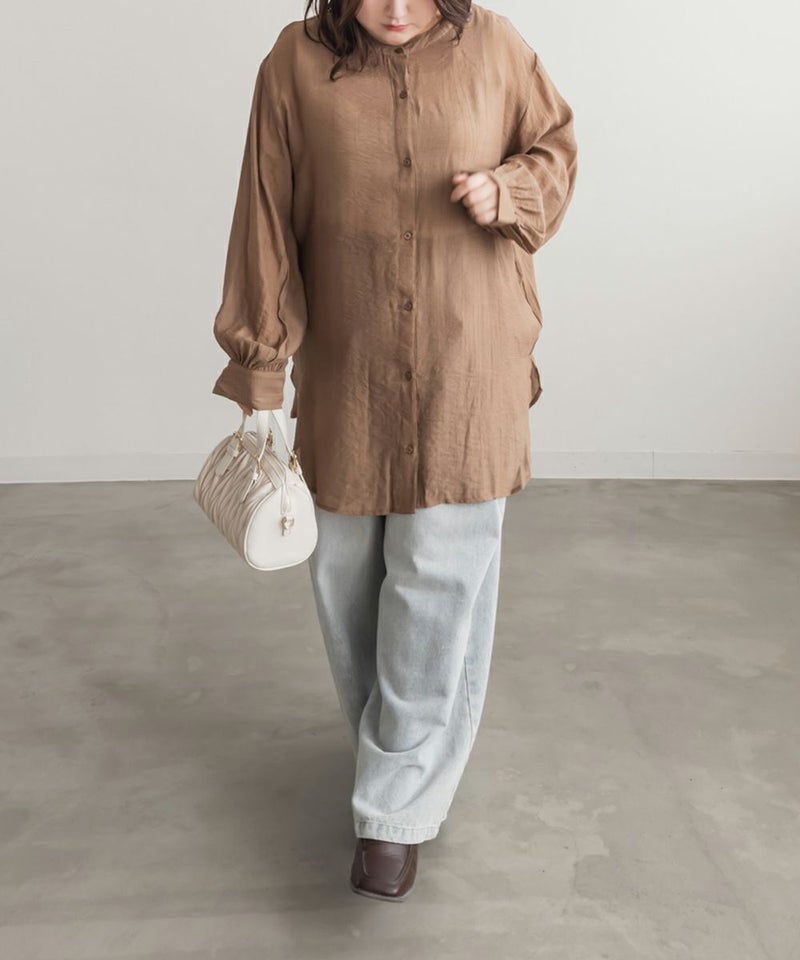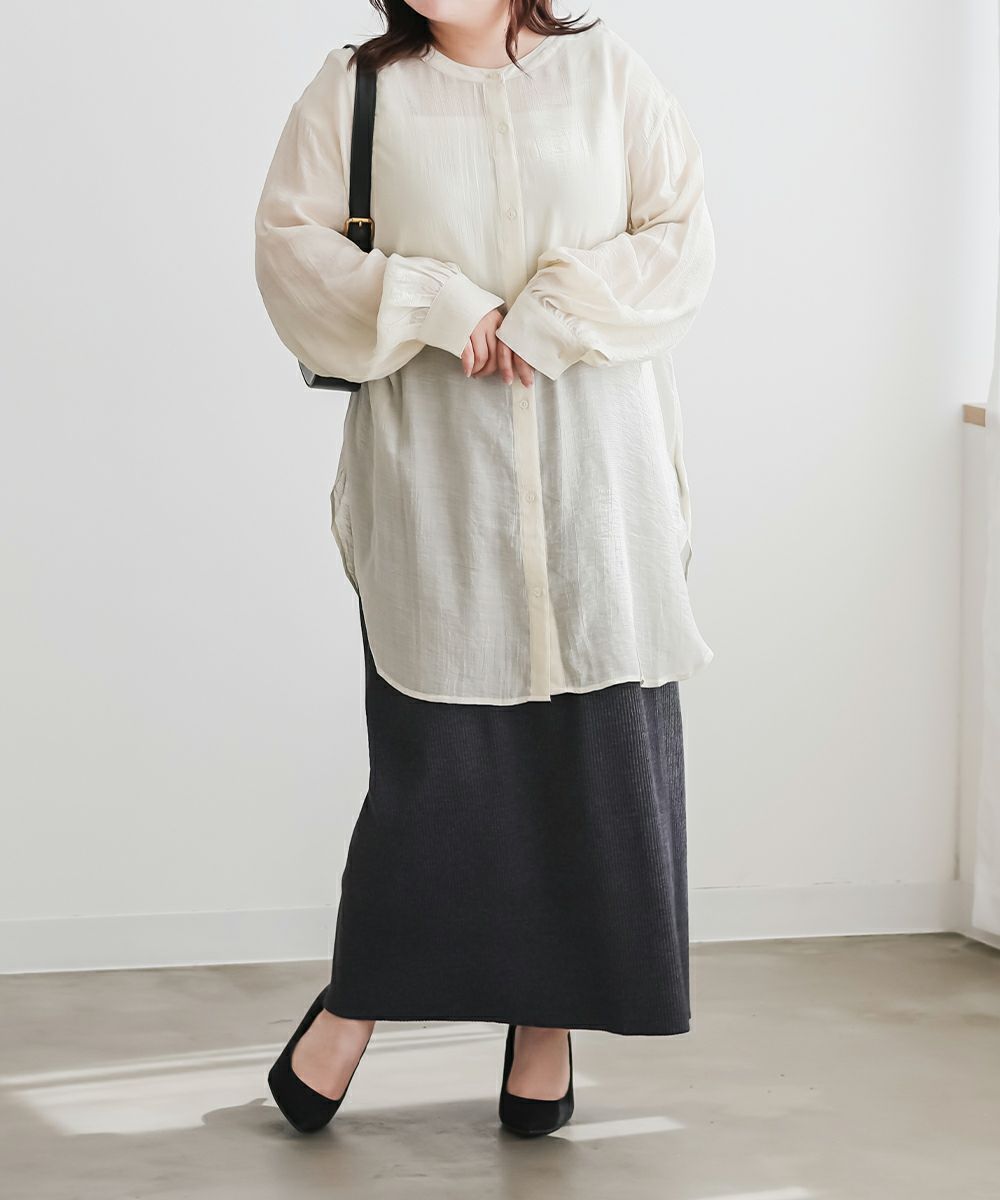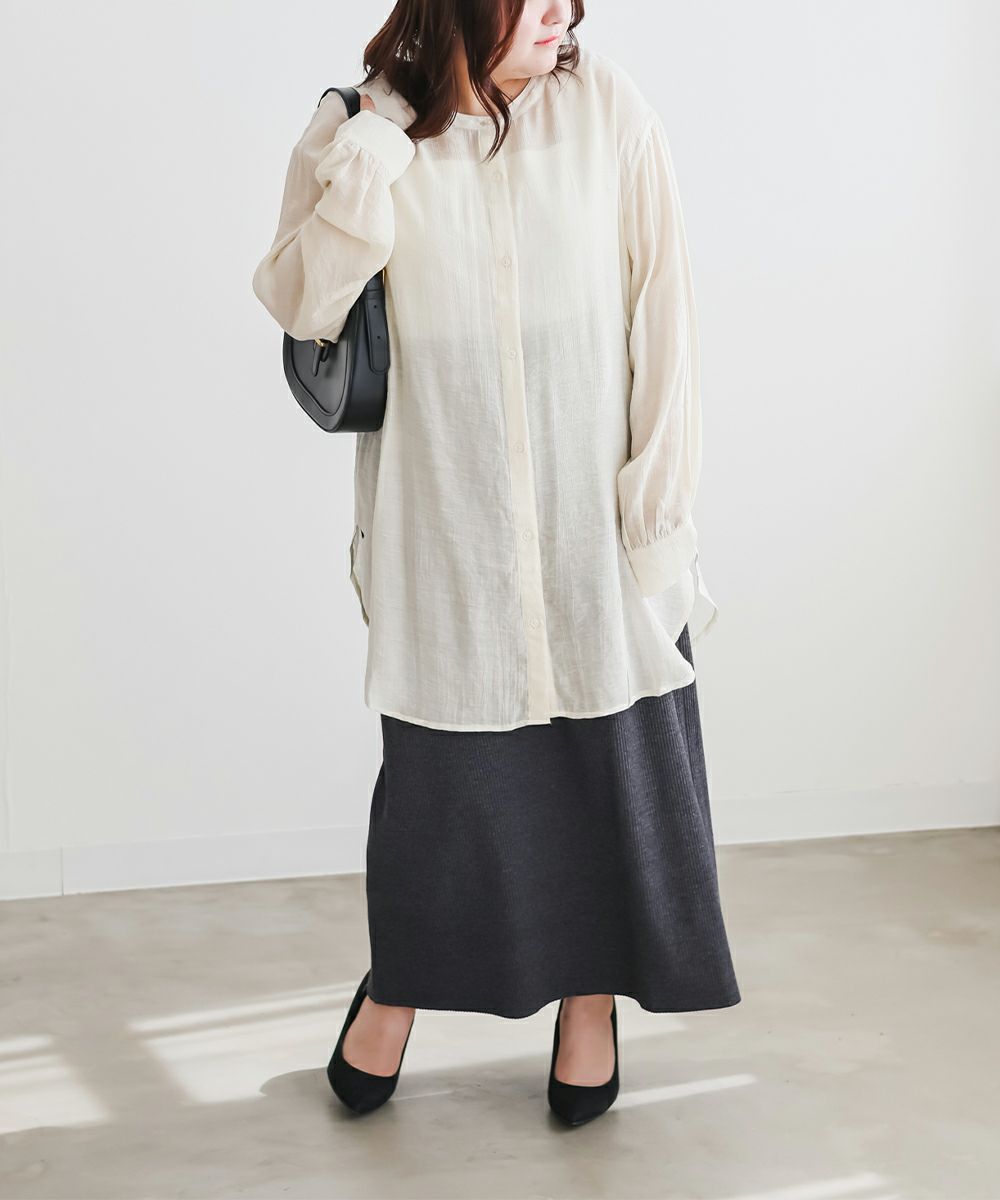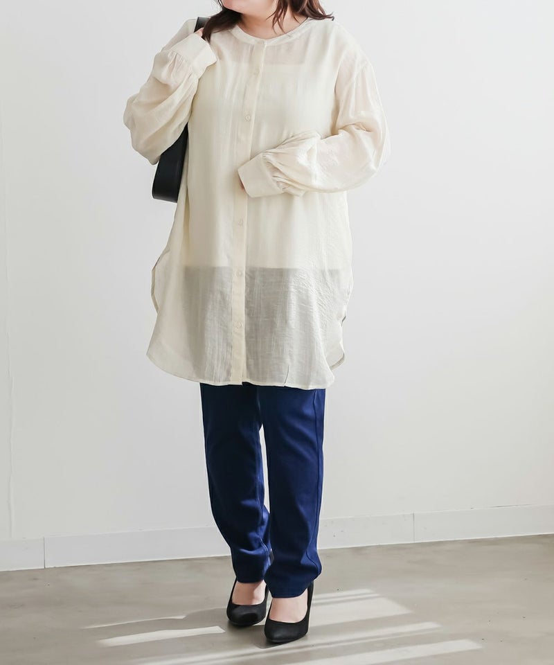 3Lサイズを着用して、ゆったりとしたシルエットでリラクシーな着心地でした♪ ふんわり軽やかなシアー素材が程よい抜け感を演出し、こなれた雰囲気になれます! ヒップまでしっかり隠れるチュニック丈なので、体型カバーも叶います! 前を開けて羽織りとしても、ボタンを閉じてトップスとしても着回しやすく、ロングシーズン活躍する一枚です!