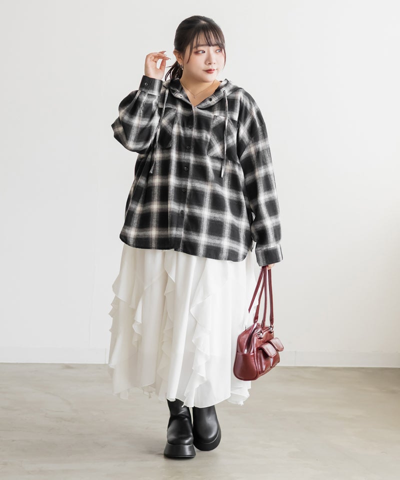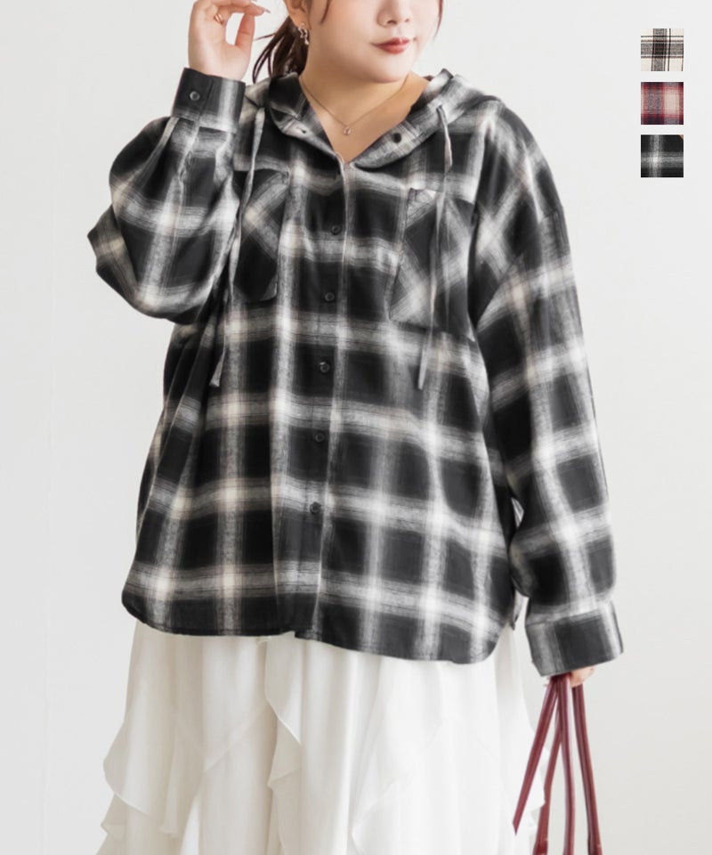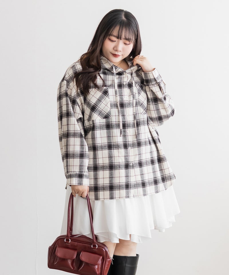 3Lサイズを着用てちょうどいいサイズ感でした。ゆるっとしたシルエットでらくちんな着心地でした。秋冬らしいチェック柄が今っぽくてこなれ感のある1枚です!トレンドのフードがついたアイテムは今季1つは持っておきたいマストアイテムです◎オーバーサイズで長めの着丈なのでヒップやお腹周りもおカバーしてくれます!ワンピなどに羽織っても可愛くて柄のあるシャツは一枚あると色々コーデに着まわせるのでおすすめです♪