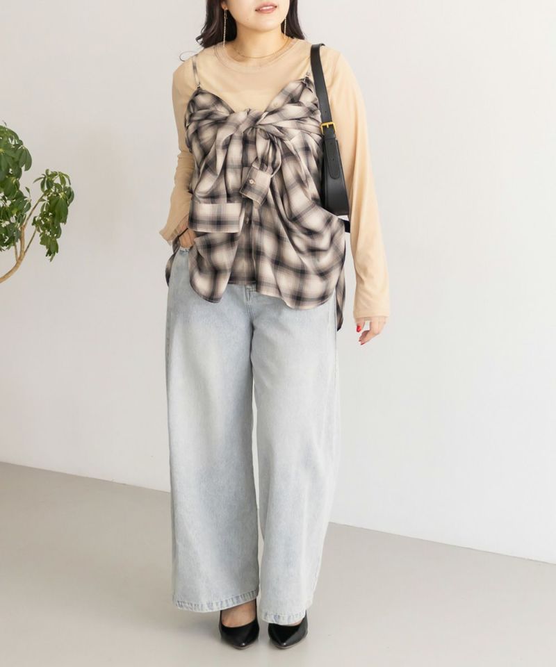 3Lサイズを着用してゆるっと着られるサイズ感でした!すこしとろみのあるさらっとした生地感で肌当たりも良く軽い着心地です◎ヒップが隠れる少し長めの丈感で、体型カバーもしてくれます!1枚でさらっと羽織っても、アレンジしてビスチェ風にも楽しめる2wayデザインで、気分に合わせてスタイリング可能です♪中に肩紐がついていて、オフショルにしても着られます!ほかにも前開きにしたり、ウエストを結んで女性らしく着崩したりとシーンに合わせて色々な着回しができました。季節の変わり目にも軽い羽織りとしても活躍して、秋らしいチェック柄がいまっぽい1枚です!