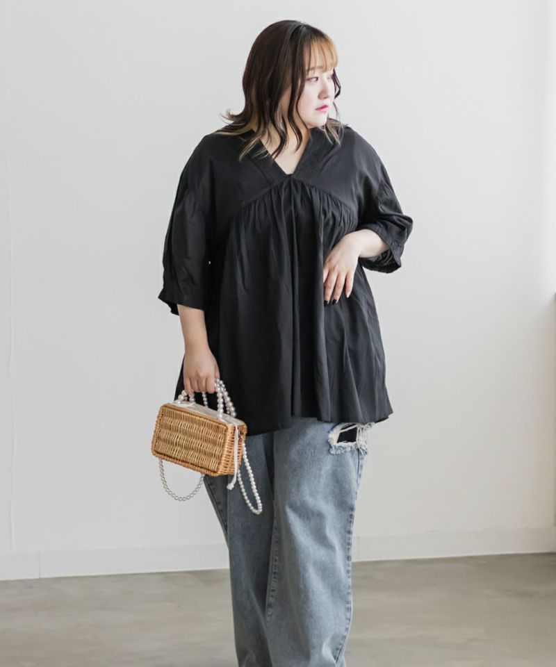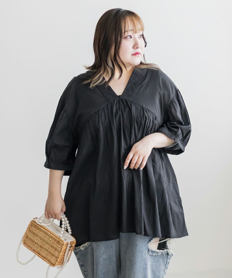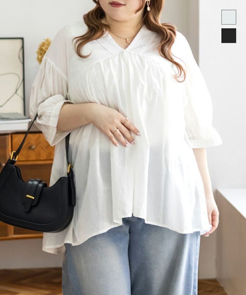 3Lサイズを着て、ちょうどいい着心地でした。とっても軽いコットン生地で、楽ちんだし涼しくて夏らしいブラウスです!華やかギャザーが印象的で、Vネックが顔回りをすっきりと見せてくれます◎夏らしい透け感×ふんわりとしたボリューム感で女性らしさグッと引き立つてて、大人に着こなせるのもポイントです!フェミニンで優しい印象だけど甘くなりすぎないのも魅力です♪ワイドパンツや、ナロースカート、スキニーパンツなどすっきりしたボトム合わせがお勧め!胸元に華奢なネックレスをプラスするとより女性らしさを引き出してくれて可愛いです!