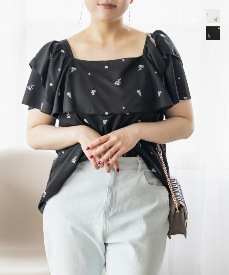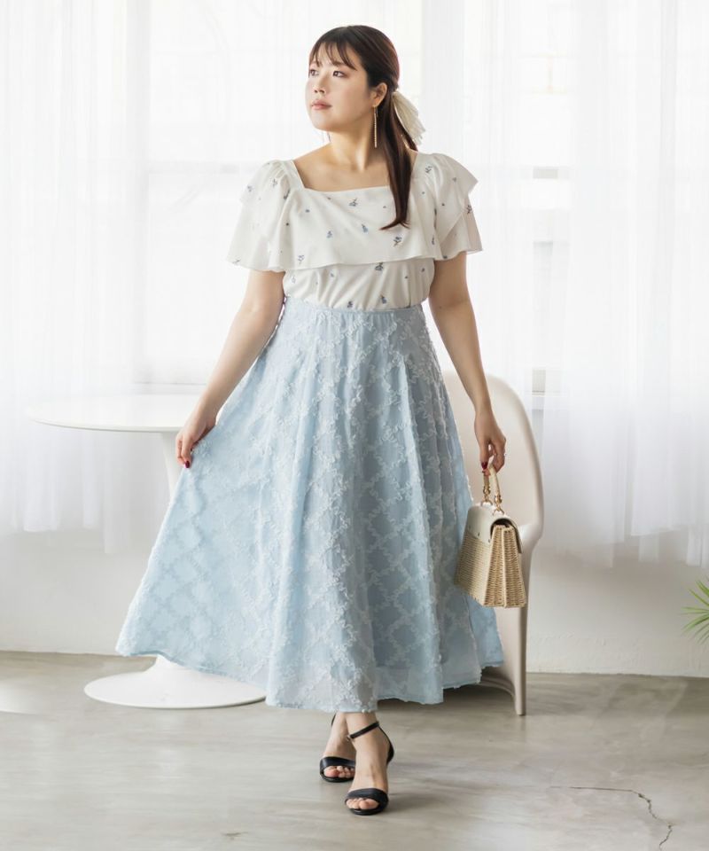 3Lサイズを着用しました。身幅は程よくゆとりがあり、肩まわりや腕も動かしやすいサイズ感でした◎生地は軽くて柔らかい夏にピッタリの涼しい素材なのが嬉しいです♪表面感のあるワッフルジャガードに、繊細なフラワー刺繍が映えて、1枚でパッと華やかな印象に♪袖のフリルは甘すぎず、上品な可愛さを演出してくれます。パンツにもスカートにも合わせやすく、キレイめにもカジュアルにも着こなせる、着回し力の高い1枚です!