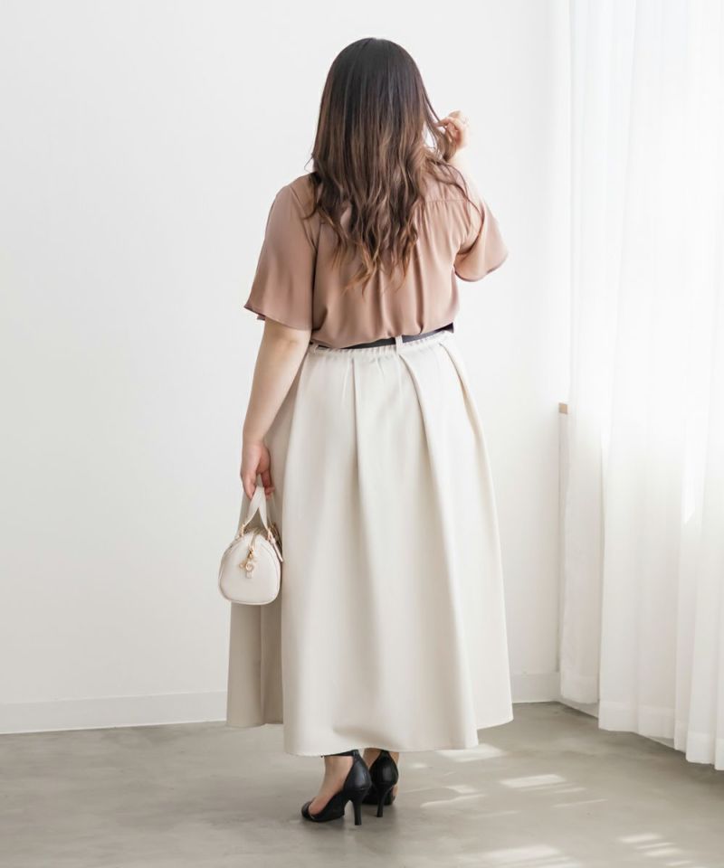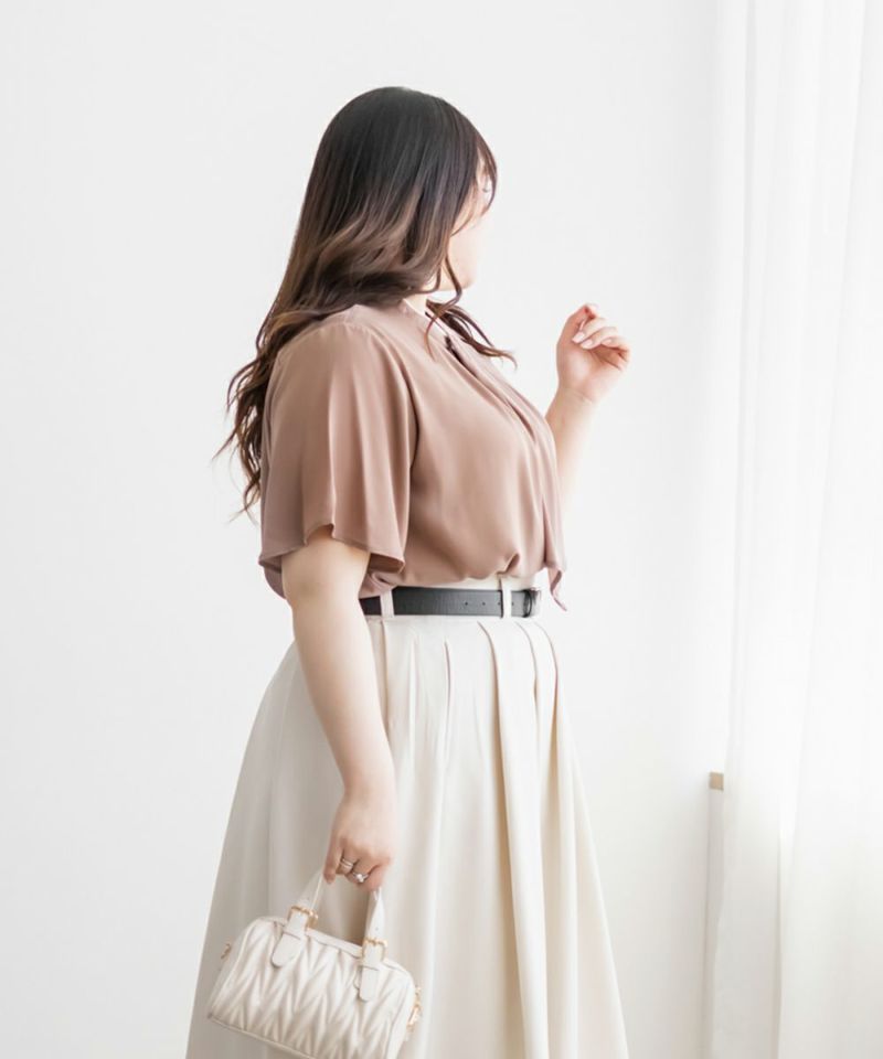 3Lサイズを着用して、ちょうどいいサイズ感でした。タイ付きで上品な印象のブラウスです!さらさらした柔らかい生地で、涼しく着用出来ました!ふわっと広がる袖口が女性らしくフェミニンな雰囲気です♪細身のテーパードパンツやスラックスを合わせてオフィスシーンにもお勧めです!
