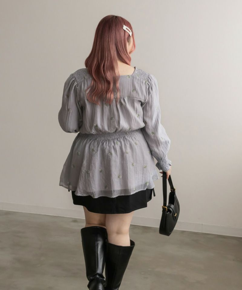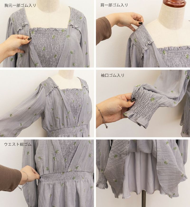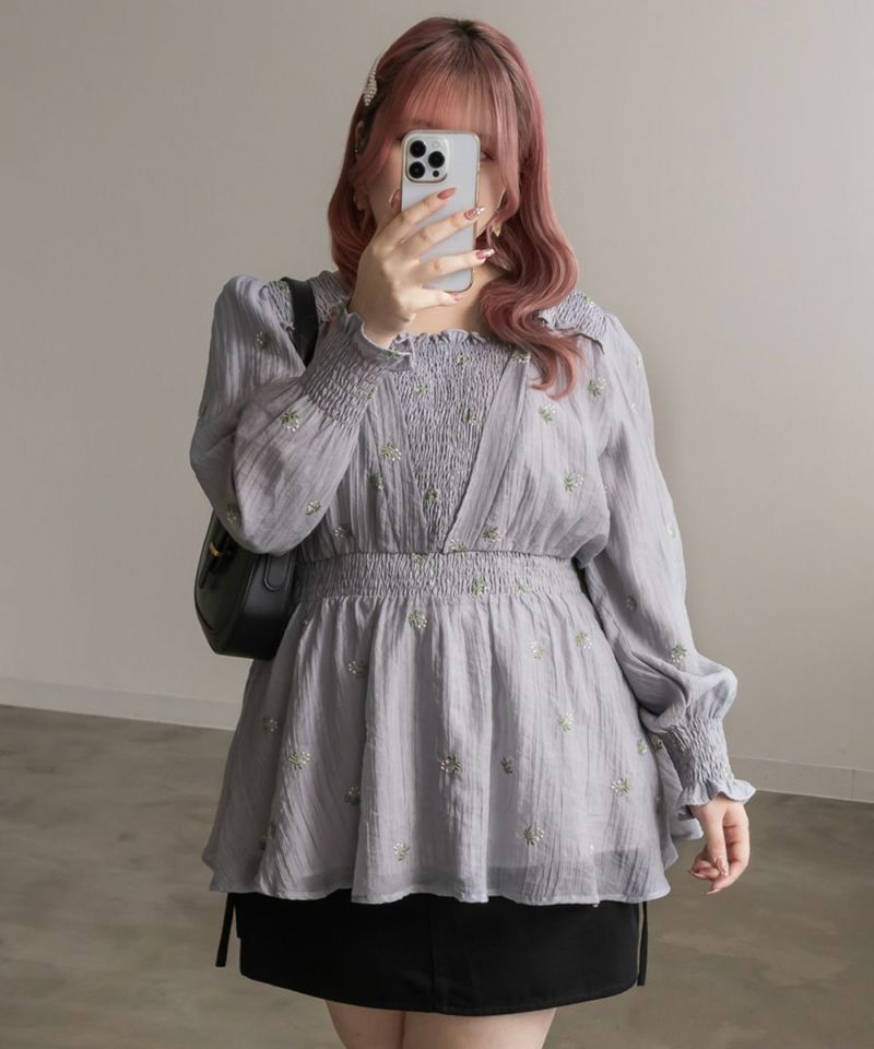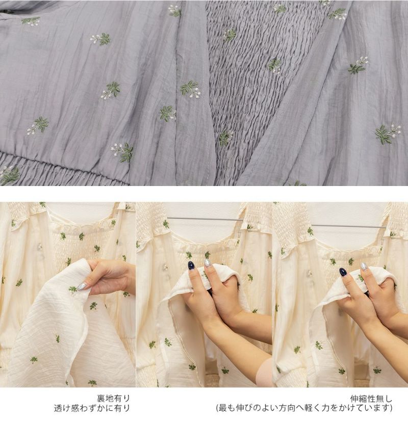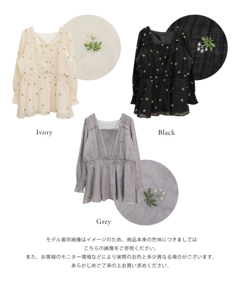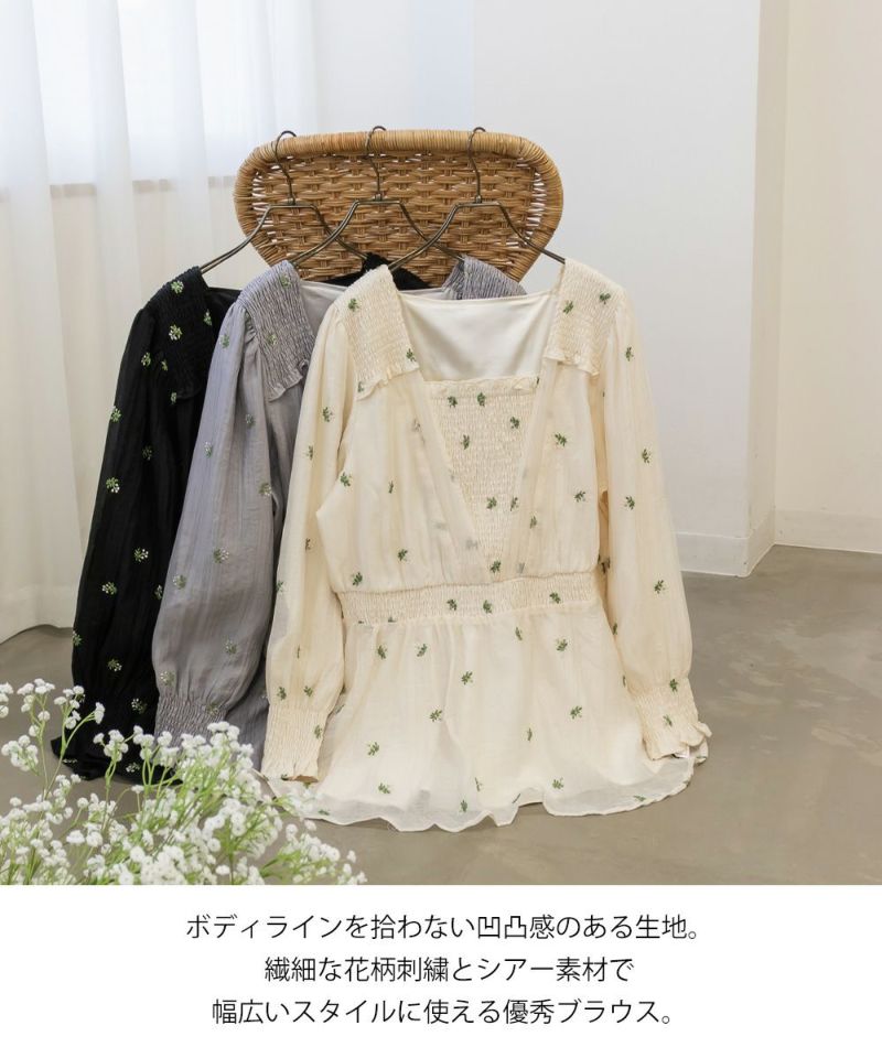 CLETTE オリジナル 刺繍 花柄 ブラウス 長袖 シャーリング 旅行 デート フェミニン トレンド CLETTEオリジナル★花柄刺繍シャーリングブラウス