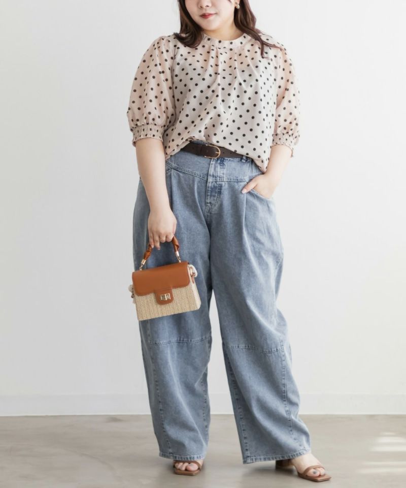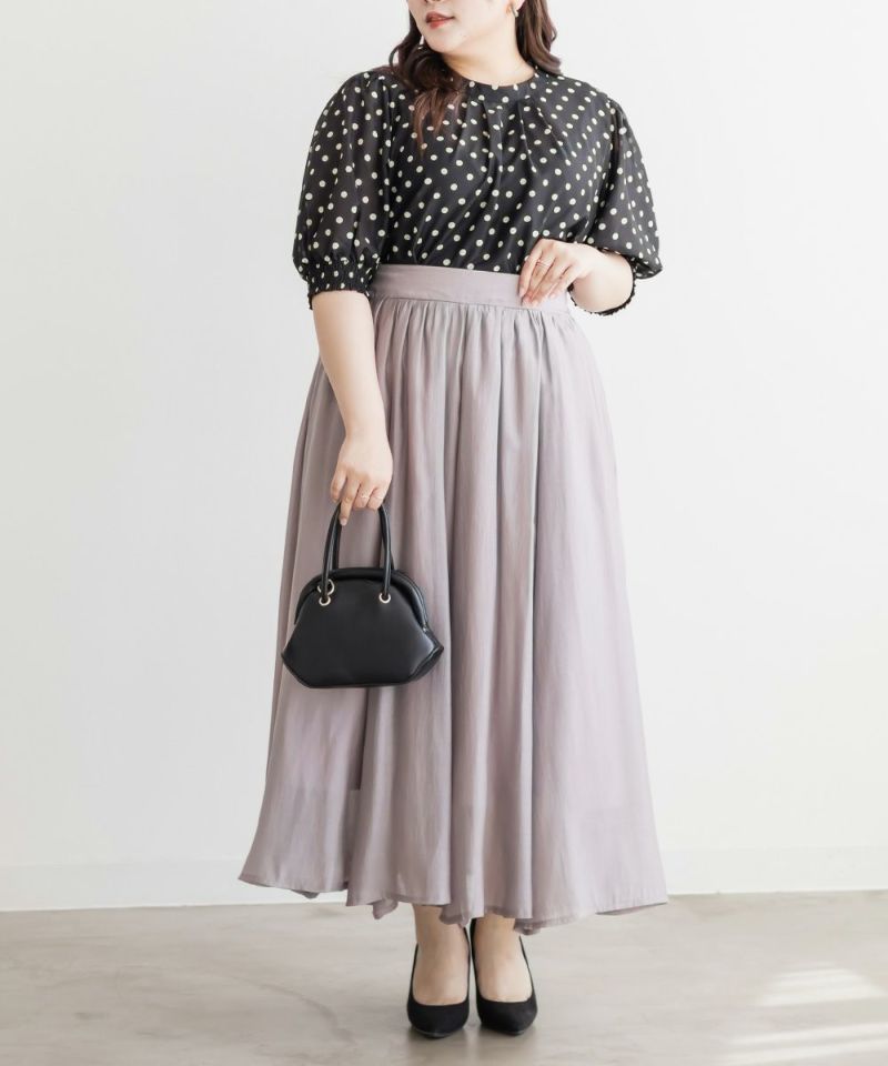 3Lサイズを着用して、ぴったりのサイズ感でした。窮屈感は特に感じなかったのでいつも通りのサイズ選びで問題なさそうです!袖口はシャーリングになっているのと、気になる二の腕はすっぽり覆ってくれるのが嬉しい◎プチハイのネックラインとドットと合わさってよりガーリーフェミニンな印象になります◎少し透け感のある生地でなのが春夏らしくて涼しく着用出来ます!ワンピースやスカートと相性抜群で、お出かけやデートにおすすめです!デニムとドットの相性も良く、カジュアル派さんにもおすすめの1枚です♪