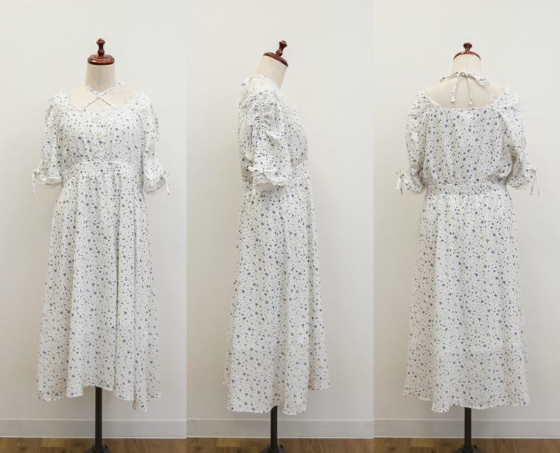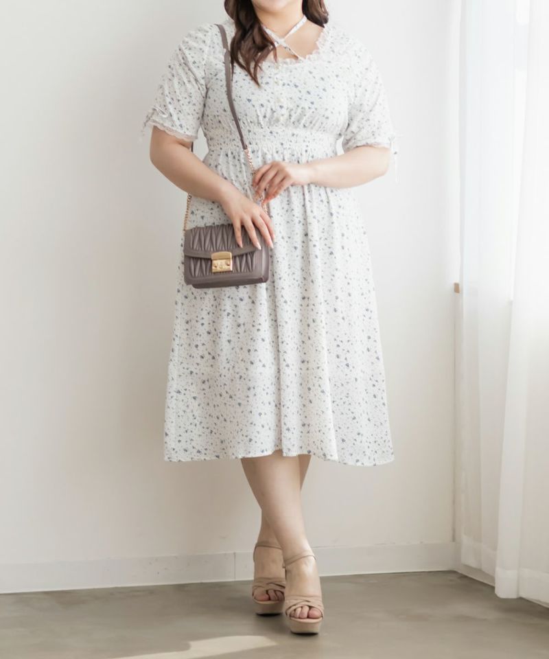 3Lサイズを着用して、全体的にちょうどいいサイズ感でした◎シフォン素材がとても軽くて、動くたびにふわっと揺れるシルエットがとっても可愛いワンピースです♪ウエスト部分はゴム仕様なので、締め付け感もなく、着心地もラクでした。ネックのリボンデザインなど細かい部分がガーリーで可愛いです♪丈は短めで、春夏らしく涼しく着られます◎低身長さんでもバランスよく着られると思います!デイリーからデートなど幅広く使えそうです。