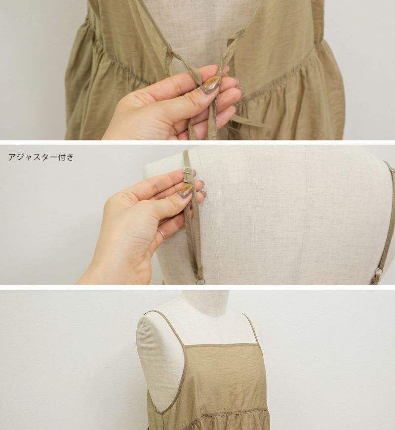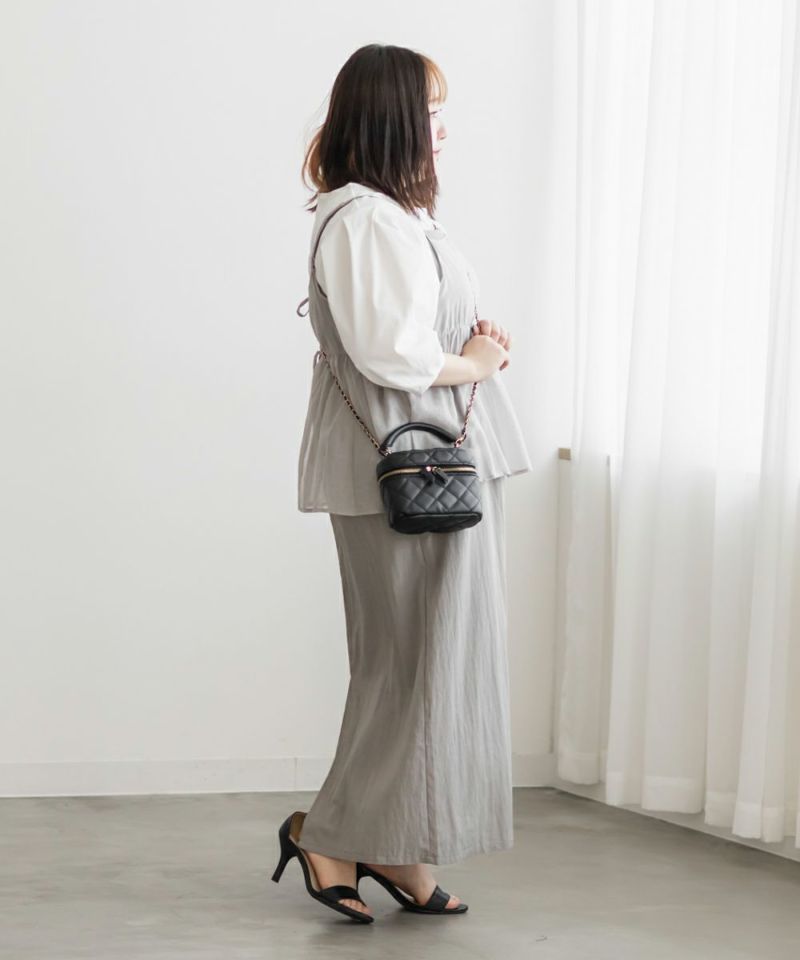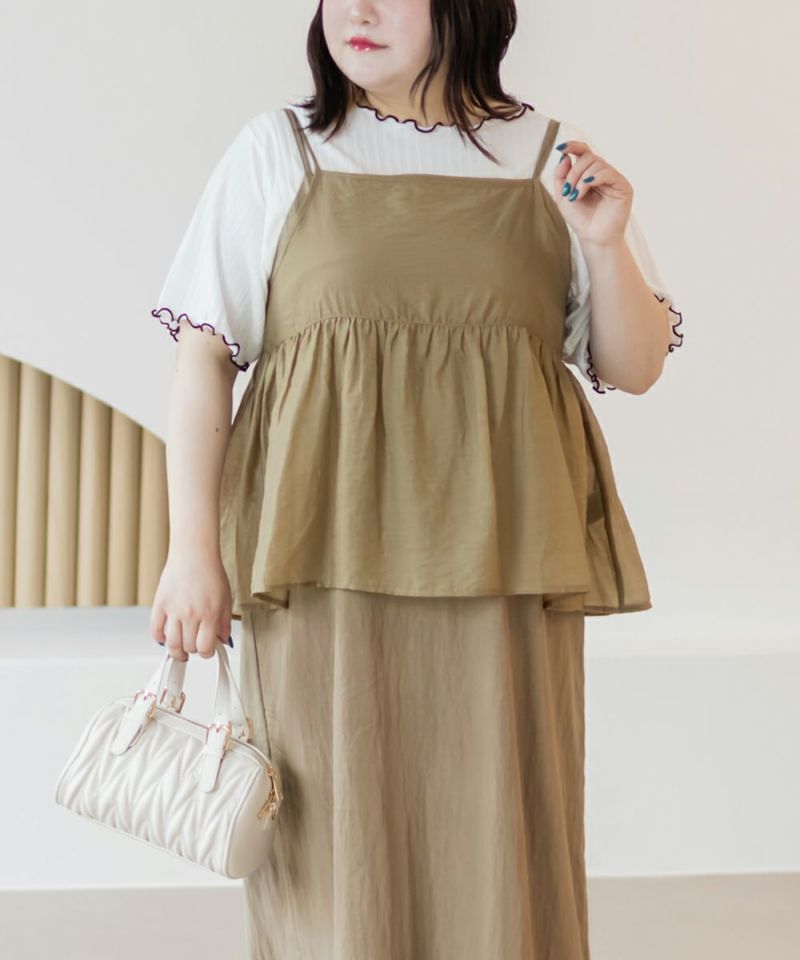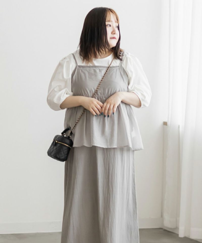 3Lを着て程よくゆとりのあるサイズ感でした。ワンピースはゴム入りですが、すっきりとしたシルエットなので、心配な方はサイズ確認をお勧めします◎シアー感がかわいいビスチェがセットになったキャミワンピースで、重ねて着るのが今っぽくて、ビスチェのふんわりペプラムがお腹周りもカバーしてくれる、優秀アイテムです♪それぞれ単品でも使いやすい色味・デザインなので、1セットあると着回しに便利なアイテムです!オールシーズン着られて、たくさんコーデを楽しめます!