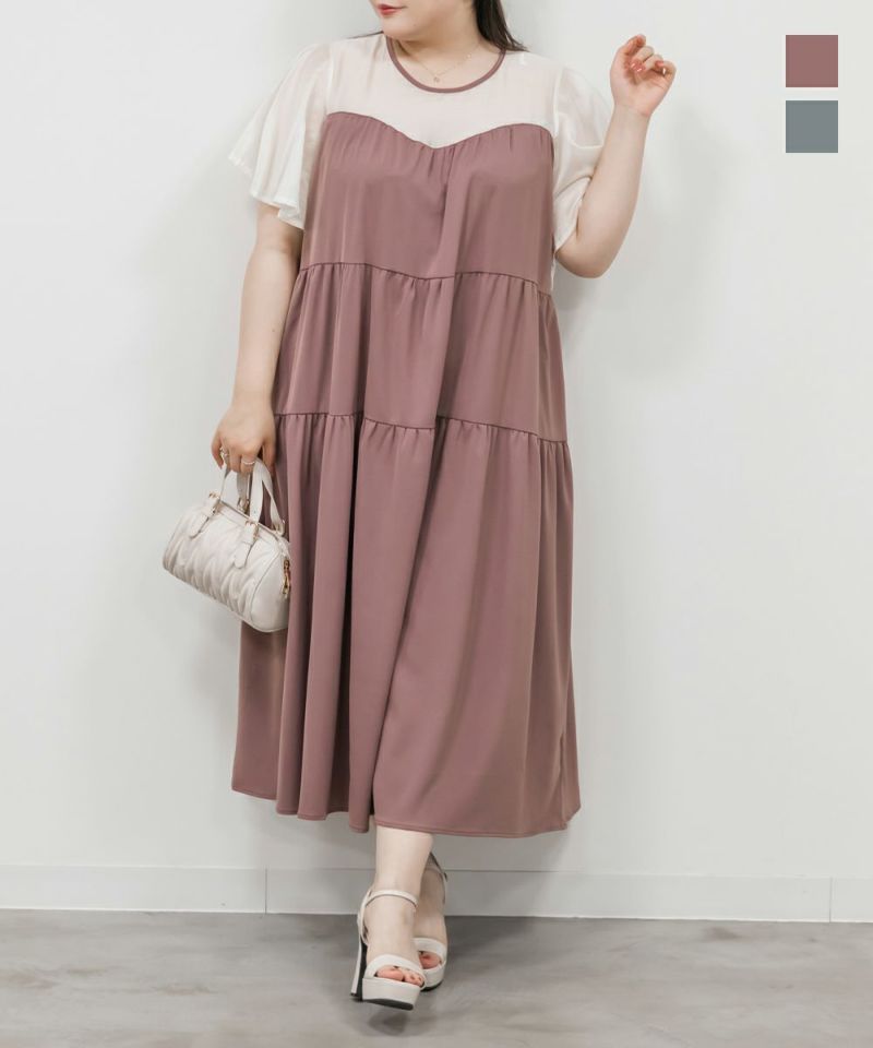 3Lを着て着用感はちょうどいいです◎たっぷり広がりがあって窮屈感も全くなく着られました! シアー素材の切り替えが涼しげで、見た目にも軽やか♪ ふんわり広がるフェミニンなシルエットで可愛さも安心感もあります◎ティアードデザインが広がりすぎず落ち感があるので、大人っぽい印象もあります!透け感も気にならず、1枚でサマになるワンピです♪