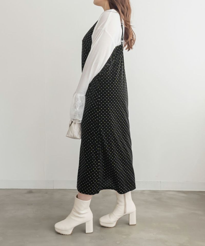 3Lサイズを着用しましたが、ちょうどいいサイズ感でした。生地自体が柔らかく伸びもあるのでらくちんに着られました!ドット柄ベロアと胸元にレースをあしらったデザインが上品で、1枚で華やかな印象を与えてくれます。ストンとした落ち感のあるシルエットで身体のラインを拾いすぎず、インナー次第でロングシーズン着回せるのも嬉しいポイントです。Tシャツやニットとレイヤードしてカジュアルにも、ブラウス合わせでフェミニンにも着こなせる万能ワンピースです。