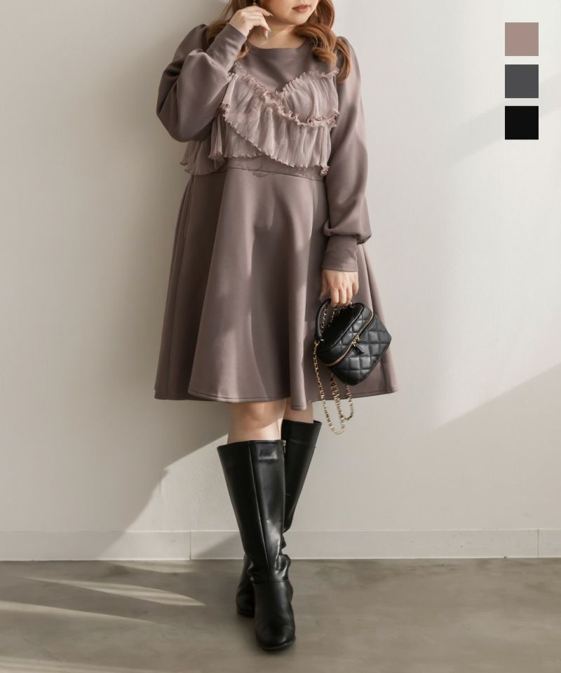 3Lを着て丁度いいサイズでした。トレンドのチュール生地を使ったビスチェをレイヤードしたようなデザインで1枚でかわいい!らくちんなワンピにチュールがくっついていてお腹や二の腕など気になる部分をしっかりカバーしてくれます◎1枚でフェミニンなスタイルが完成するコーデいらずの可愛いワンピースです!ボディラインを拾いにくい生地感とディティールがポイントです!重ね着が苦手な方でも悩まずにレイヤードスタイルになれて、可愛いだけじゃなくて着やせを考えたデザインなのが嬉しいです!