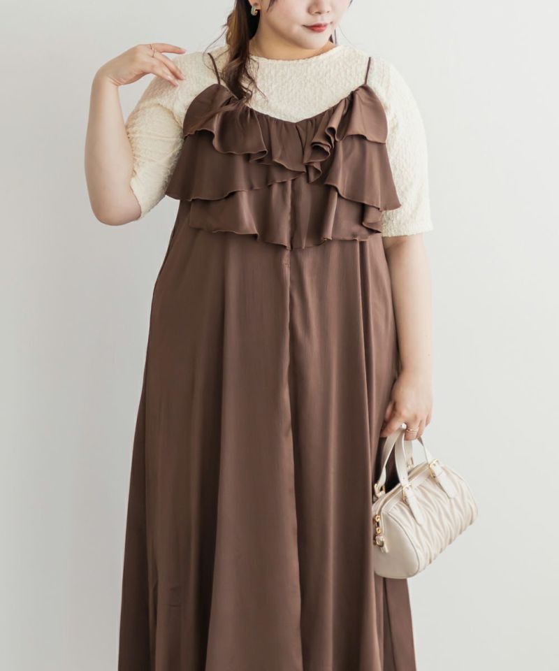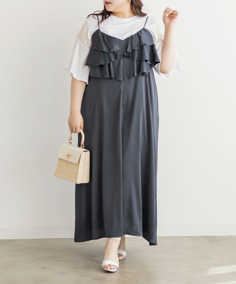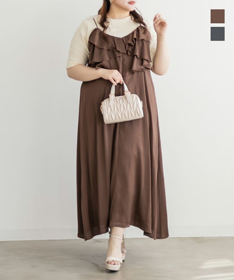 3Lを着て丁度いいサイズでした。胸元のラッフルデザインがかわいく、顔回りをすっきりさせてくれる効果も◎全体的にすっきりした縦のシルエットで着用出来るので、華奢な印象です♪さらりとした艶感のある生地が今っぽくて一気にトレンドコーデに!大人っぽい印象になれちゃう1枚でデートや旅行におすすめのワンピースです!