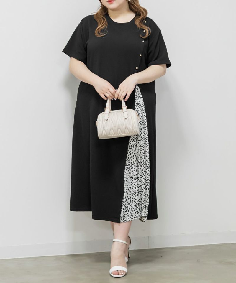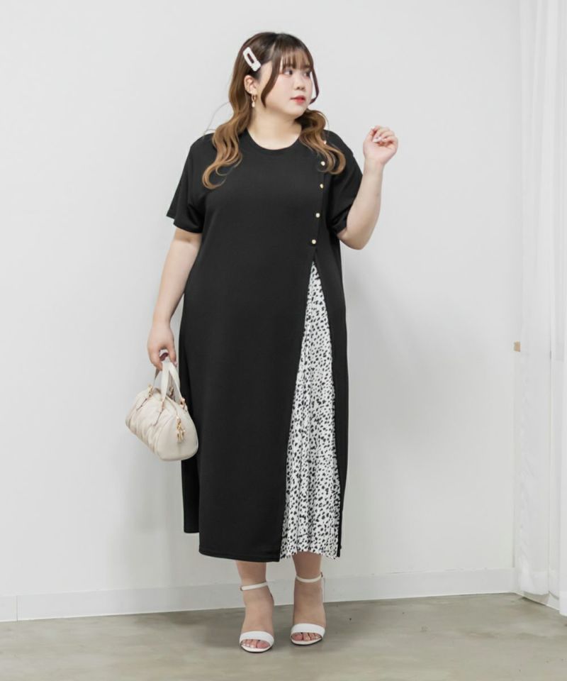 3Lを着て、ちょうどいい着心地でした。らくちんなシルエットながら、プリーツ切替やボタンデザインでしっかり抜け感もある1枚です♪1枚でサマになるワンピースなので、小物を変えるだけでオン・オフどちらにも使えそうです!